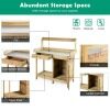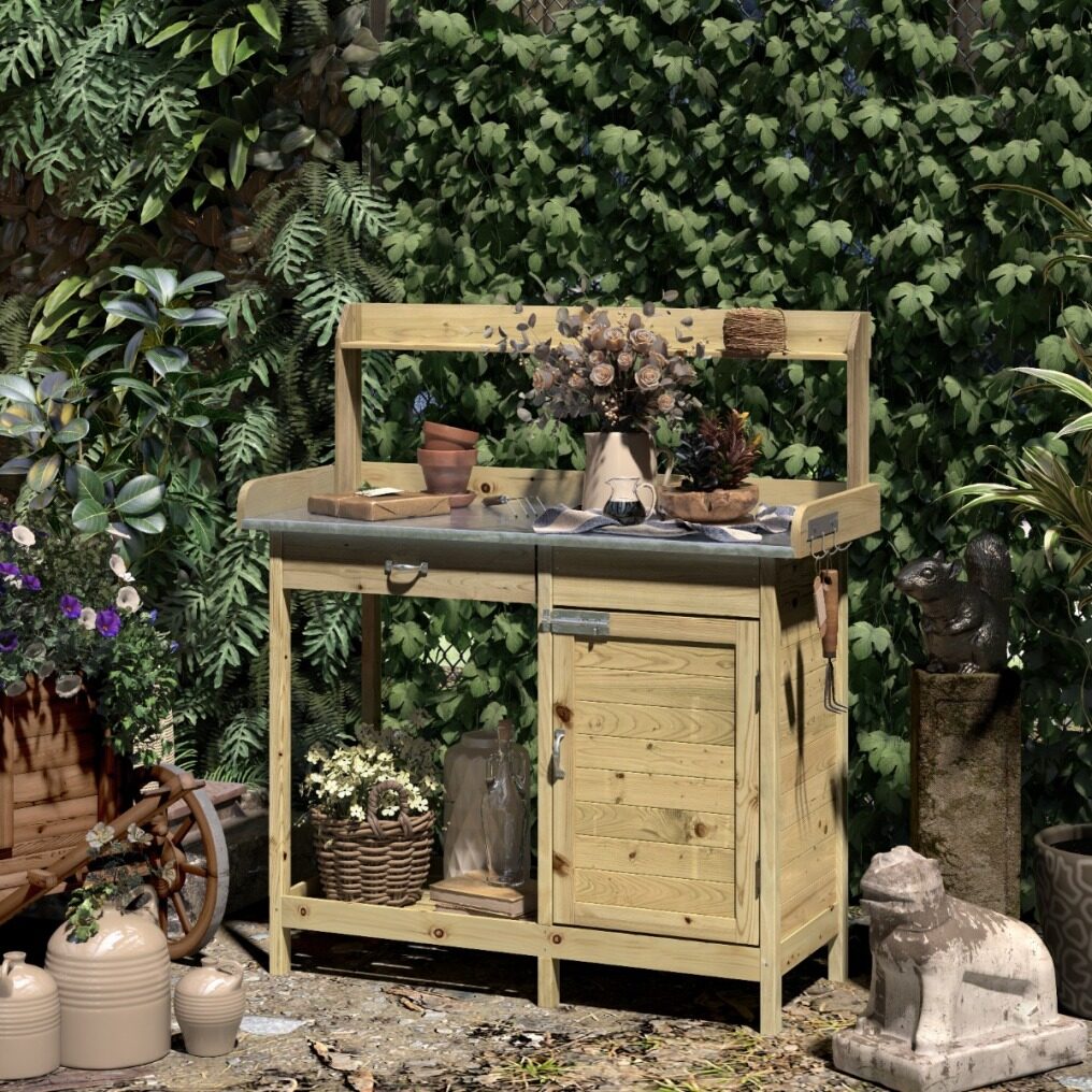 Our potting bench table is a perfect assistant for your garden tasks. Supported by thickened galvanized table top and sturdy legs, our wooden plant bench workstation is strong enough to hold your tools, plants and other supplies. It has a large drawer, a roomy cabinet, 3 premium hooks and an open shelf to help you organize your items. Thanks to the large tabletop, you can put various items on it without worrying about running out of storage space. It can be placed in the garden, balcony, backyard and more.