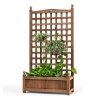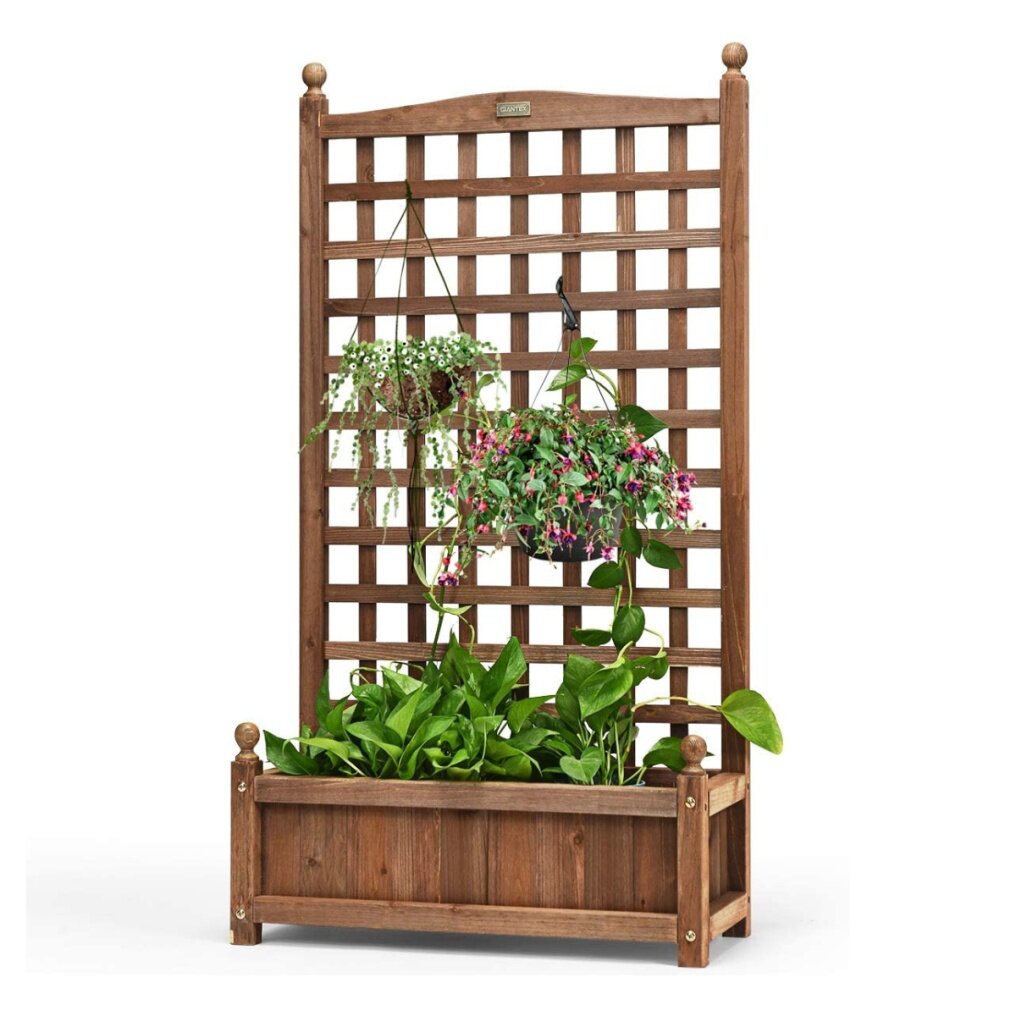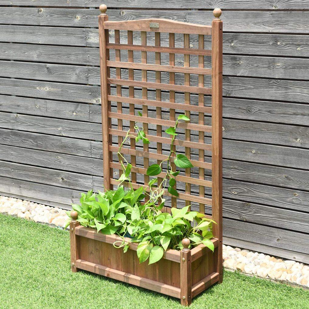 Our planter with trellis can solve your problem. This is our planter with trellis which is made of solid wood and has unique and beautiful appearance. The natural fir is durable which can be used for a long time. You don't have to worry about the wood breaking which is caused by exposure to the sun and wind. This pot has a grid design to support your climbing plants. The water outlet can be easily drained, allowing the plant to grow better. Our planter with trellis has a very large flower box that can hold a variety of plants you like. Of course, you can also grow crops. The exterior design is simple and easy to match and it is ideal to place in yard, garden, patio or balcony to be a perfect décor with many of your favorite plants. Our planter is definitely superior in quality.