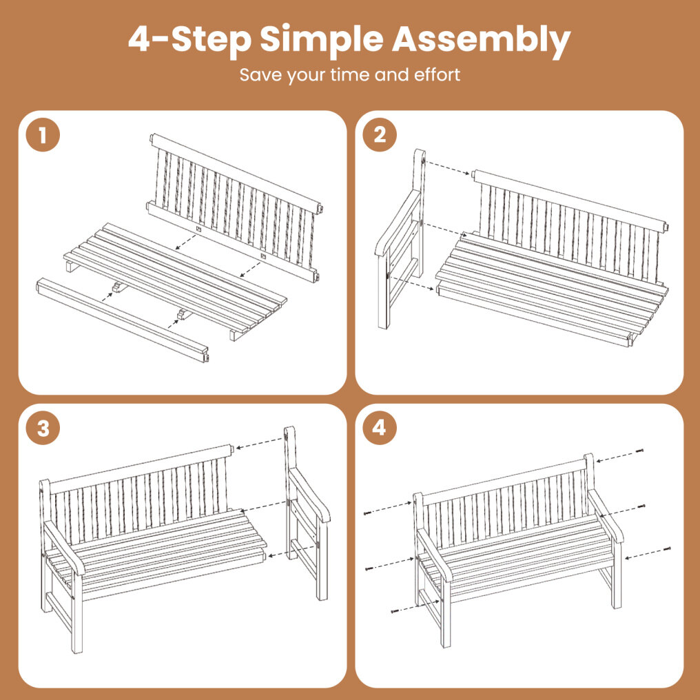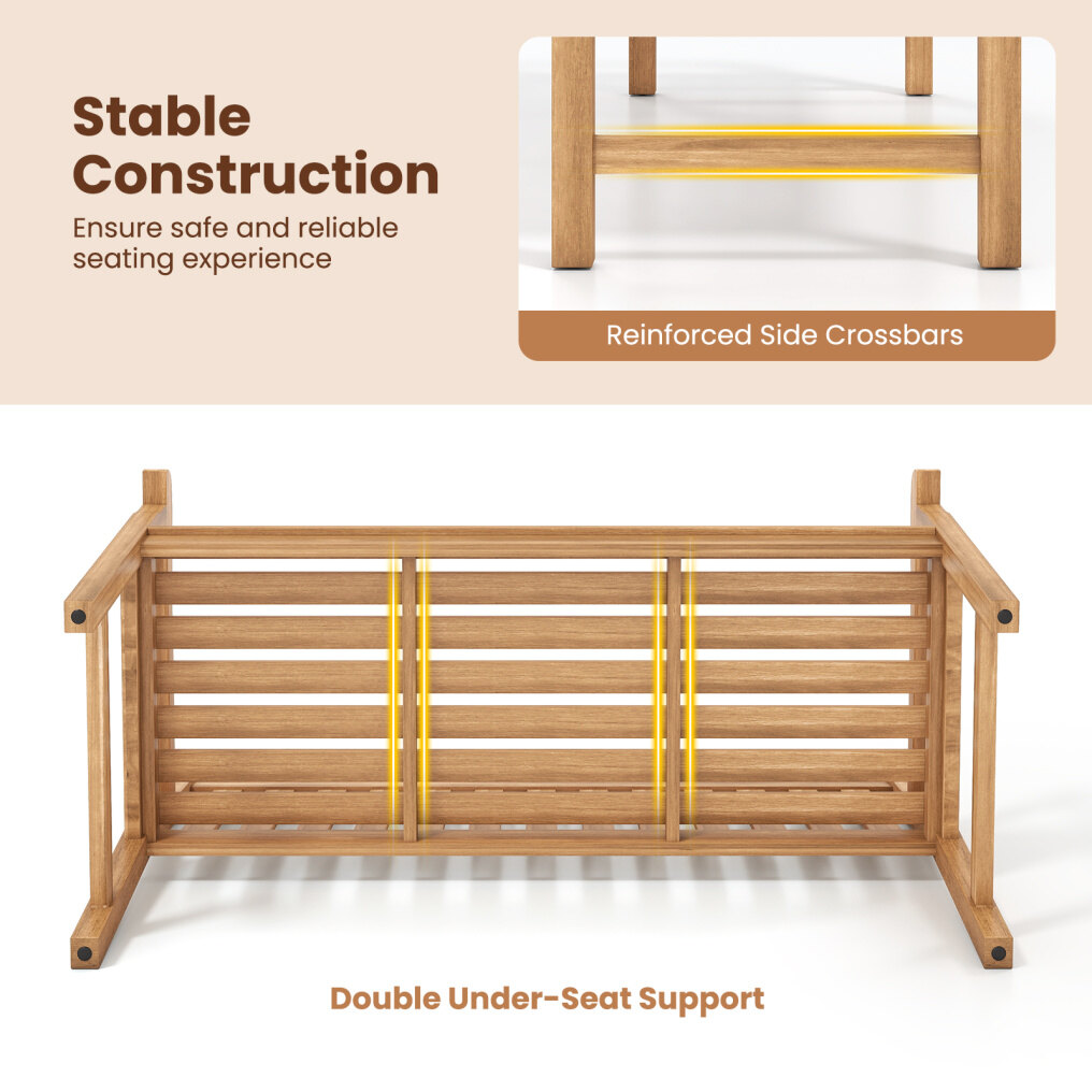 ● Reinforced Construction: This 62-inch solid wood bench is reinforced with 3 sturdy crossbars under the seat bottom, while each side is supported by an additional horizontal bar. Consequently, this advanced framework effectively prevents wobbling, ensuring robust support and long-lasting safety.
