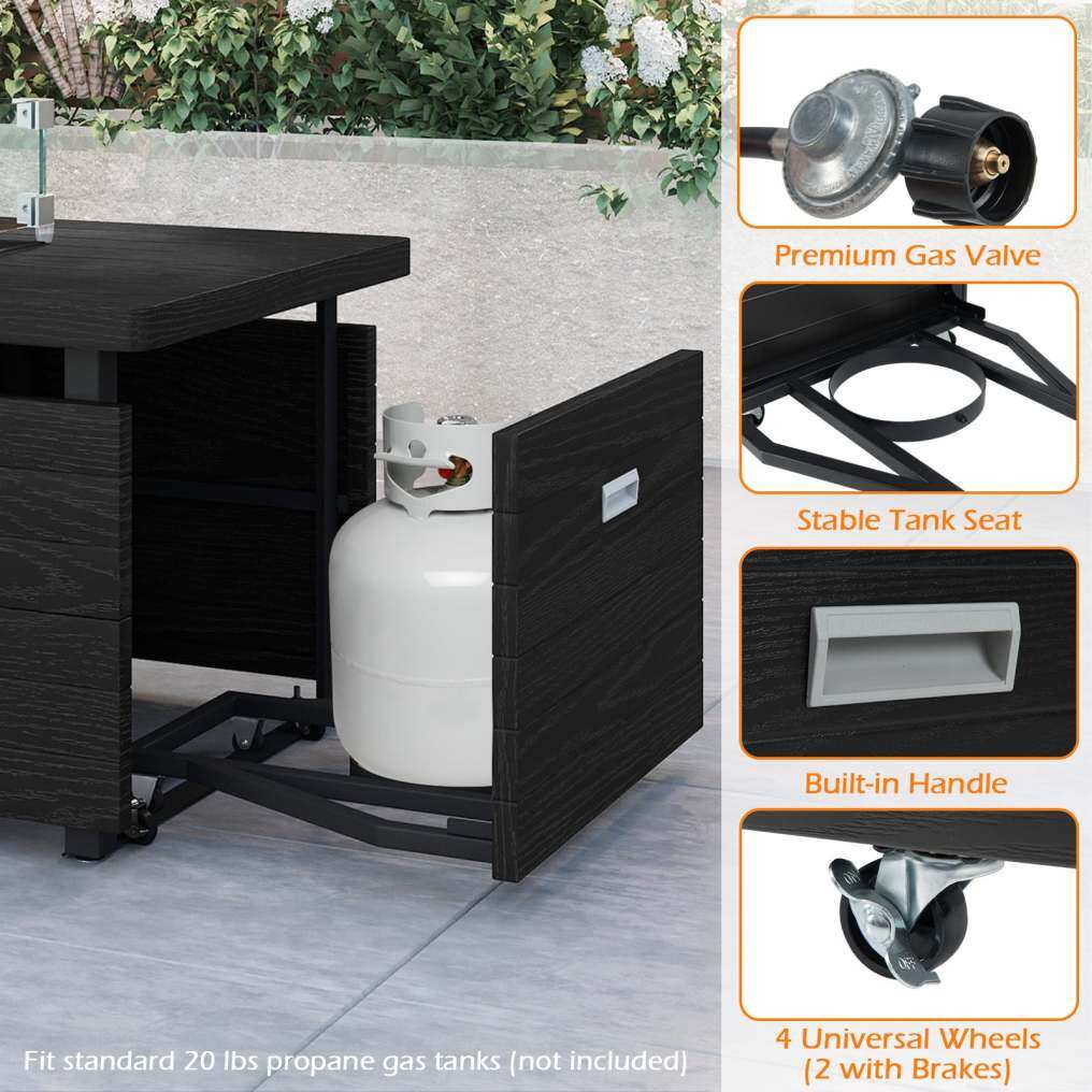 ● Rolling Tank Storage Option: Designed for easy use, the rectangular propane fire pit includes storage for a propane tank, featuring a built-in handle and 4 universal wheels (2 with bakes) for mobility. The stable tank seat can fit a standard 20 lbs propane gas tanks (not included), while the premium gas valve simplifies connection.