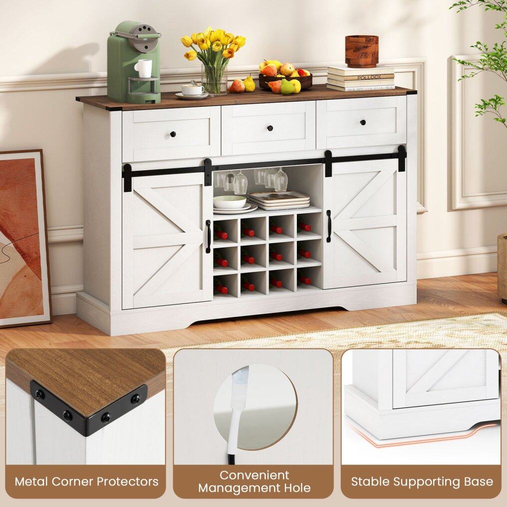 Perfect Display and Storage: Featuring a spacious top, 3 pull-out drawers, and 5 storage compartments, the sideboard buffet cabinet allows for easy organization of your belongings. It includes 2 rows of glass racks for up to 6 wine glasses, as well as a detachable wine bottle holder with 12 slots for versatile storage options.