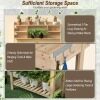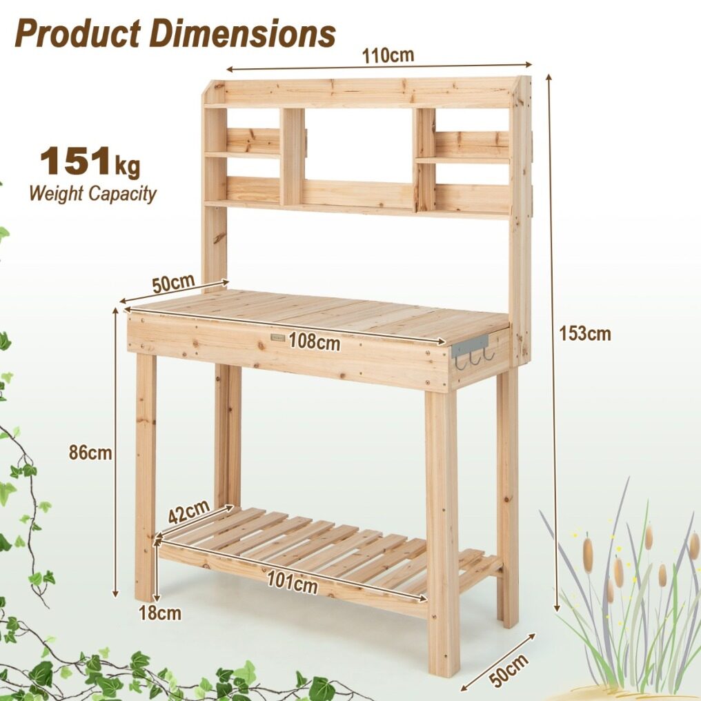 Sufficient Storage Space: The wooden garden workbench comes with various storage areas to facilitate your gardening work. There exists symmetrical 3-tier long shelving for placing potted plants, a bottom shelf for placing large gardening tools and fertilizers, and 3 handy side hooks for hanging tools and wipe cloth.