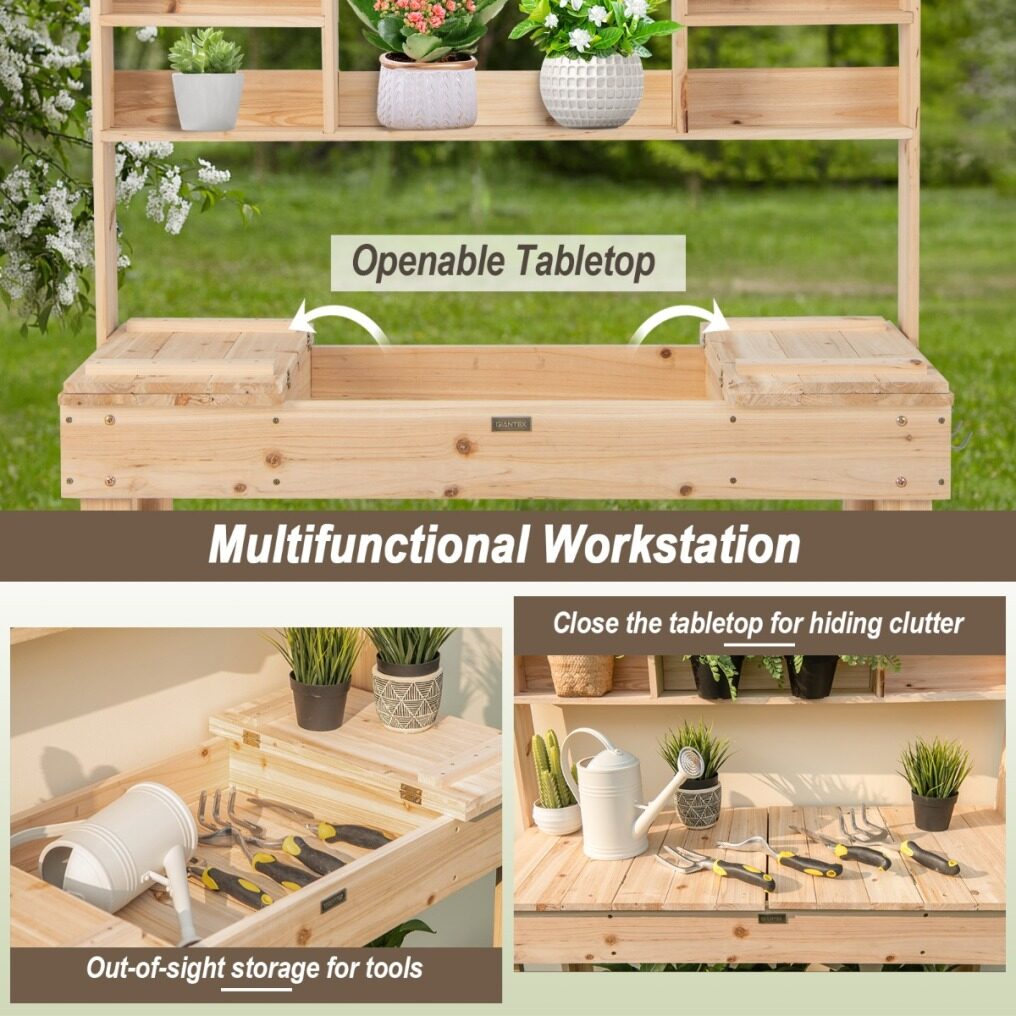 Our farmhouse potting bench table measures 110 x 50 x 153 cm (L x W x H) and comes with various storage areas, keeping all your gardening supplies close at hand. And the 86 cm ergonomic height design helps you reduce the risk of backache or knee pain when enjoying your gardening work. There exists a long shelf and 5 short shelves for placing gardening tools and potted plants and a large bottom shelf for holding soil or other large supplies. More than that, it is equipped with an openable tabletop and a hidden storage area, allowing out-of-sight storage for tools and seeds. Besides, the wooden workbench table is crafted with 100% solid fir wood, which is not easy to deform or absorb water, ensuring long-lasting durability. The wood surface has no paints, so you can paint on it with your imagination, creating a perfect addition to your garden!