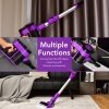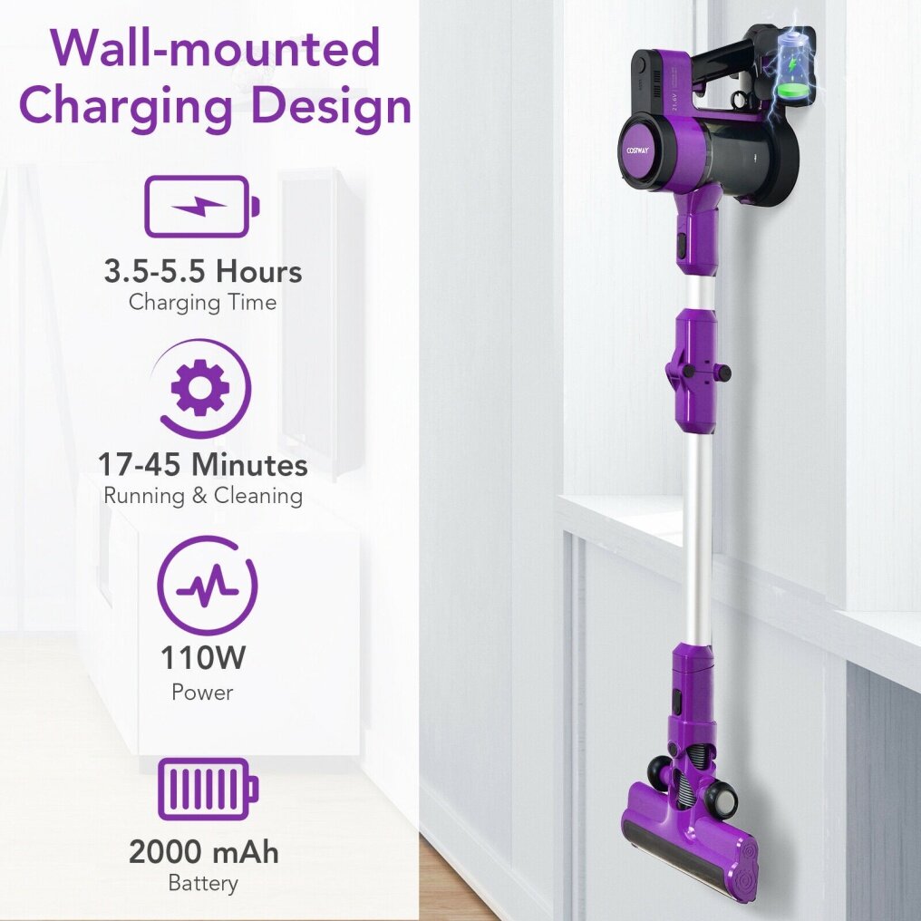 For a quality vacuum cleaner, long runtime and strong suction power is very important. This handheld vacuum cleaner is equipped with a 2000mAh 6-cell lithium battery and can be charged on the wall-mounted charge stand. A fully charged vacuum can support 45-minute operation in low mode (2.5Kpa) suitable for dust, hair, and confetti, and 17-minute operation in high mode (7Kpa) suitable for small solid wastes. Plus, thanks to powerful motor, the noises will not exceed 80 db. Besides, to avoid secondary air pollution, this cordless vacuum is equipped with 4-stage filtration system which can also be washed by warm water. The cleaning of dust cup is also convenient. There is a one-touch cleaning system, you only need to pull the dust release ring and all dust in the cup will be cleaned up. Meanwhile, it is equipped with carpet brush, small brush, and flat crevice nozzle. The brush head is also 120° horizontally and 90° vertically rotatable.