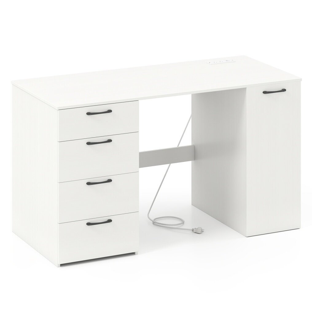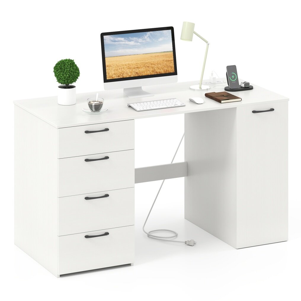 53 Inches Computer Desk with Power Outlets and 4 Storage Drawers-White