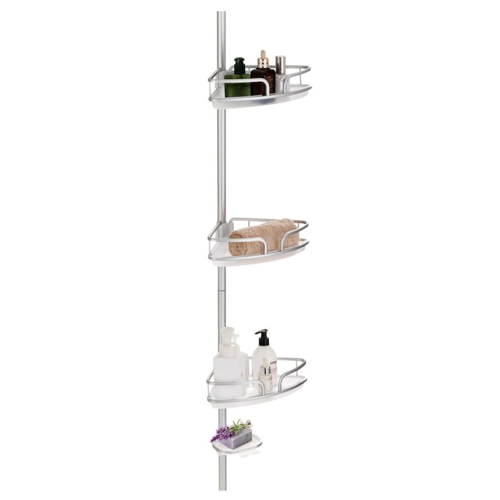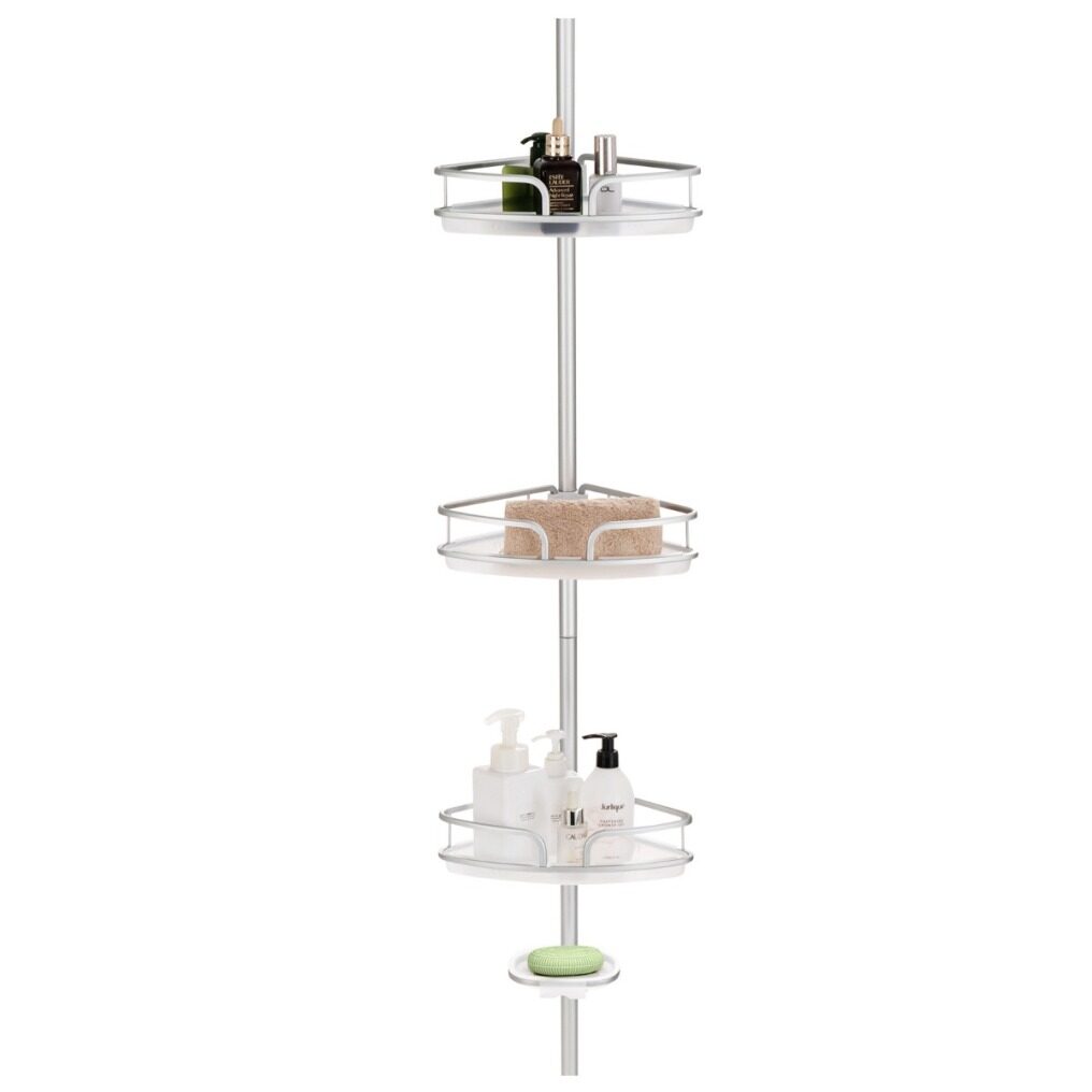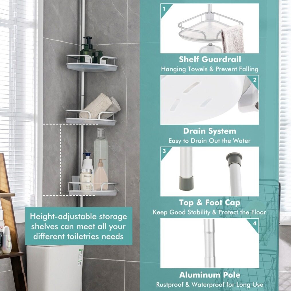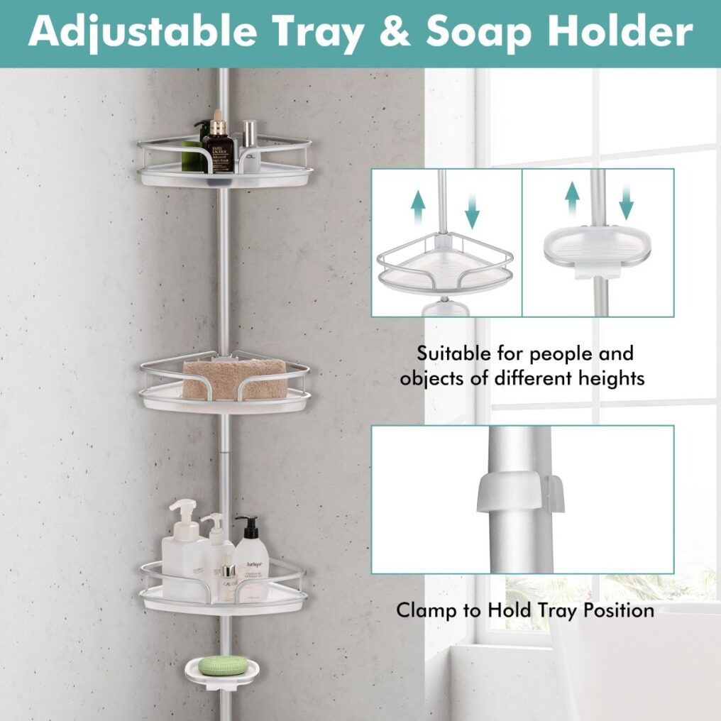 Keep your shower room clean and tidy with our corner shower caddy. Equipped with 3 baskets and a soap tray, this shower caddy offers ample storage space. The baskets and trays are free to adjust the positions to meet your different needs. Also, there are anti-falling guardrails and drainage holes for extra safety and quick drainage. Designed with an extension pole, the shower shelf is adjustable to fit most shower rooms and bathtubs and the installation is quick and easy without drilling or tools. Made of durable and rustproof aluminium material, this pole organizer can withstand wet environments, suitable for various places including shower rooms, bathtubs and kitchens.