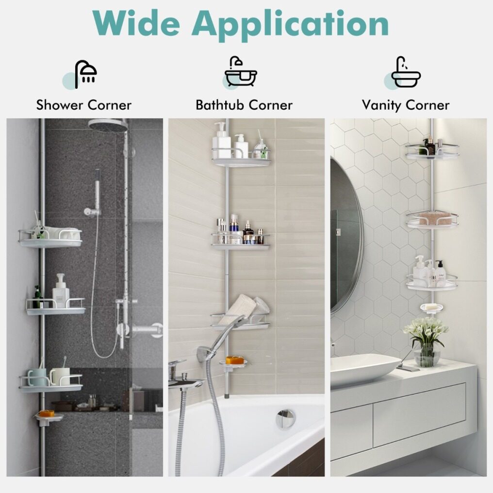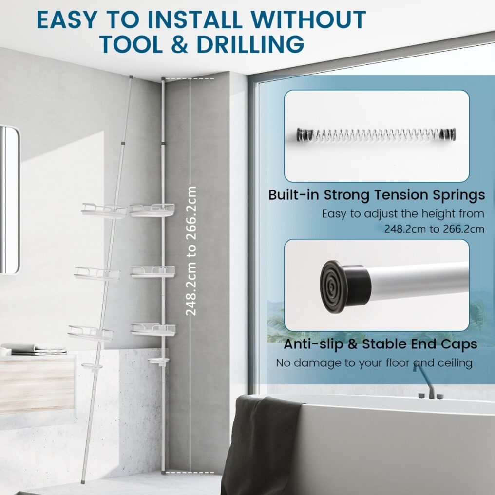 Easy & Tool-free Installation: With detailed instructions and included accessories, the installation is quick and easy. Our adjustable shower shelf is designed with an extension pole and fits in many places as long as the height is between 152 cm-274 cm. There is no need to cut the poles, drill the walls or use other tools for installation.
