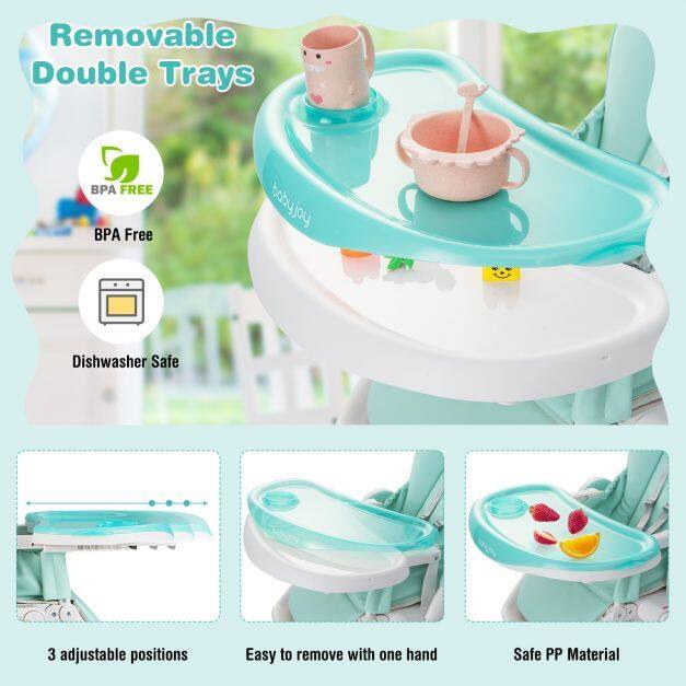 ● Removable Double Trays and Seat Cushion: The baby high chair is equipped with double trays which are removable and dishwasher safe so that the cleaning process is largely simplified. Also, the upper tray is designed with groove for placing bottles or bowels. In addition, the seat cushion is detachable and easy to clean with a damp cloth.