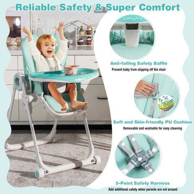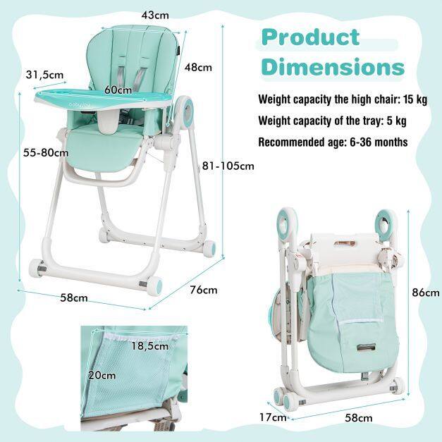 ● Folding Design and Easy Mobility: The infants feeding chair is easy to fold and unfold in seconds, saving space for storage and transport. Besides, the food trays can be suspended on the rear leg, which avoids wasting time to find or store the food trays. Moreover, the portable feeding chair is built with 4 wheels and all wheel are lockable for firm standing.