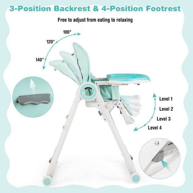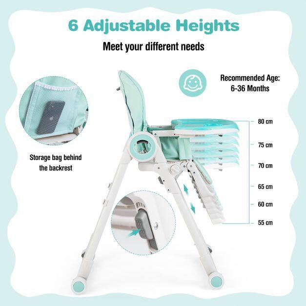 ● Flexible Adjustments Meet Different Needs: This baby high chair features 6 adjustable seat heights, 3-position backrest, 4-position footrest and 3-position food trays, allowing you to freely adjust the position according to your needs. The baby high chair can be used for feeding, playing, resting and more, accompany your baby to grow up.