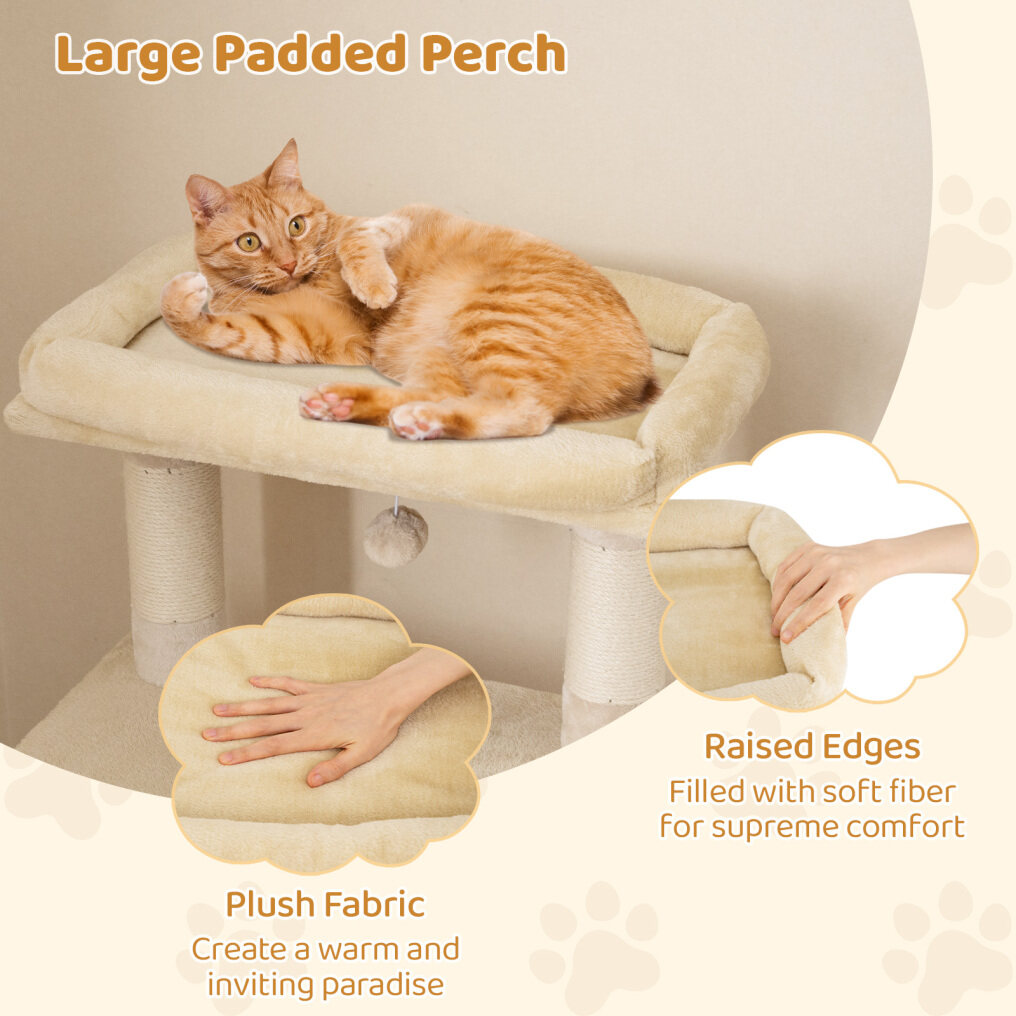 ● Deluxe Plush Padded Perch: At the top of the multi-level cat playground is a soft, thickly cushioned cat bed, offering a cozy and vantage spot for your cat to relax and observe their surroundings in supreme comfort. Plus, the warm plush covering offers a gentle touch for your beloved pets.