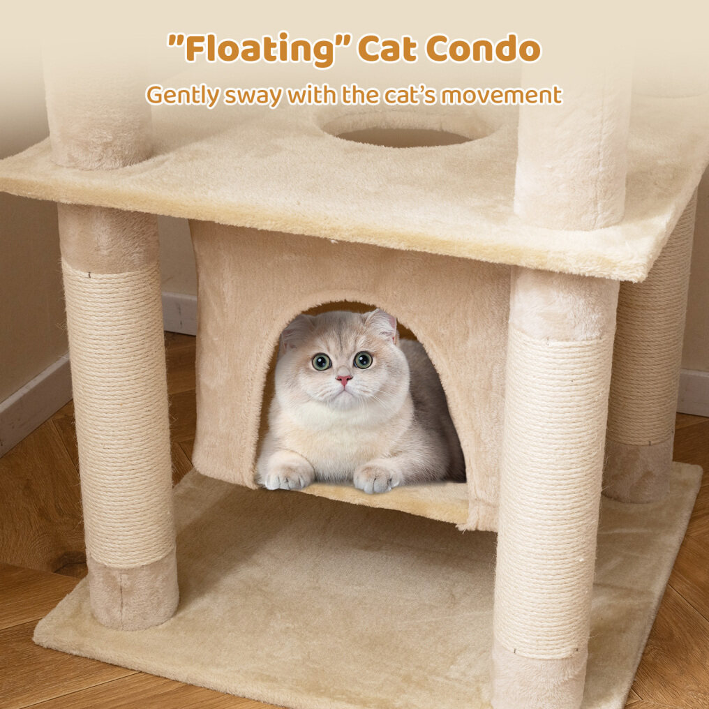 ● Unique Swaying Aerial Condo: The tall cat tower includes a special aerial cat house that gently sways with your cat’s movements, providing soothing comfort. Furthermore, its built-in skylight allows curious cats to explore the outside world from a cozy, secure spot.
