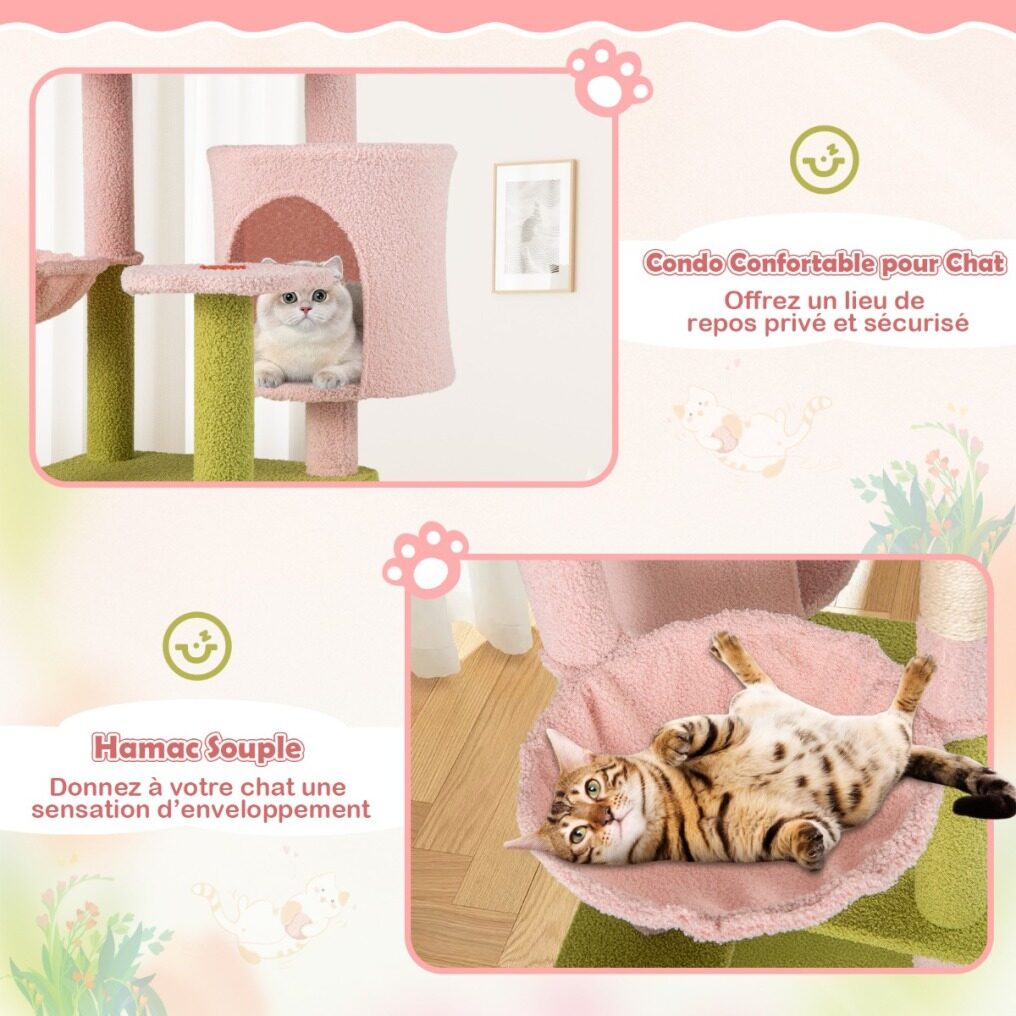 ● Multi-Layer Fun: The cat climbing stand comes with 9 layers for cats to climb up and down, and there are plush dangling balls for playful interaction. Moreover, the aesthetic cat tree is adorned in a charming pink and green floral theme with several flower elements, which could also add a touch of elegance to your living space.