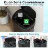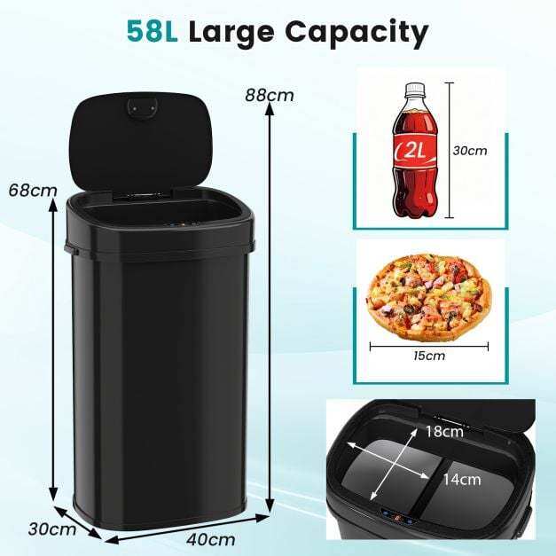 This smart bin offers dual-zone convenience, allowing you to easily separate recyclables and general waste in one unit. With a 58L capacity, it effortlessly handles waste. Equipped with a sensitive infrared motion sensor, the lid opens within 0.3 seconds when approached from within 15 cm and closes gently after 5 seconds automatically – manual control options are also available. The lid stays open at an 87° angle for hands-free access without wall contact, while the soft-close mechanism ensures quiet and secure closing. Crafted from a robust, fingerprint-resistant metal frame, this elegant bin adds style to any kitchen, office, or living space. Side handles allow for easy transport, and protective feet prevent scratches on floors.