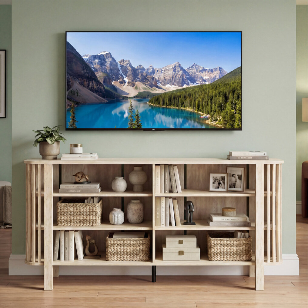 ● Suitable for TVs Up to 55 Inches: Featuring a 59" x 16"(L x W) spacious top, the TV stand can support TVs up to 55 inches. You can also mount your TV and use the countertop to display your ornaments.