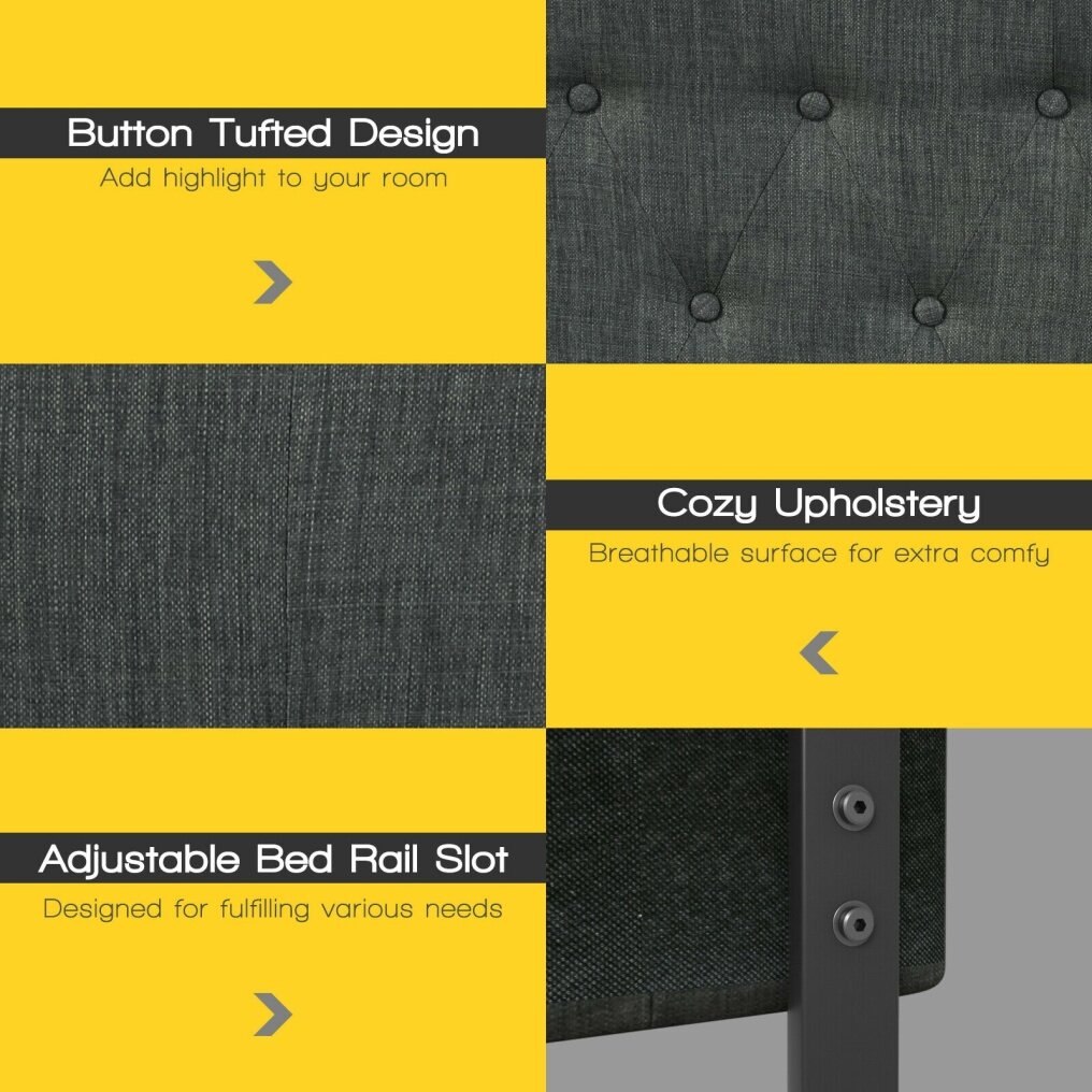Solid plywood and durable MDF ensures sturdy and durable construction for a long lifespan. The pre-drilled metal legs provide better support for headboard as well. The headboard combines premium polyester fabric and soft sponge into one to achieve comfort and relaxation. 2 adjustable heights is capable of catering to different needs and you can choose the suitable height according to your demand. Unique button ornament and elegant appearance are compatible with various room styles and fit for most queen size bed frame.