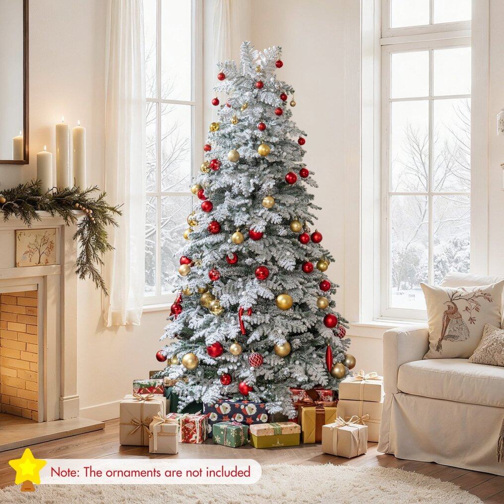 ● Charming and Realistic Appearance: Featuring 616/806 branch tips along with 130/160 twinkle balls, the artificial Christmas tree presents a lush and welcoming look. Additionally, the snow-flocked design beautifully simulates a gentle winter frost.