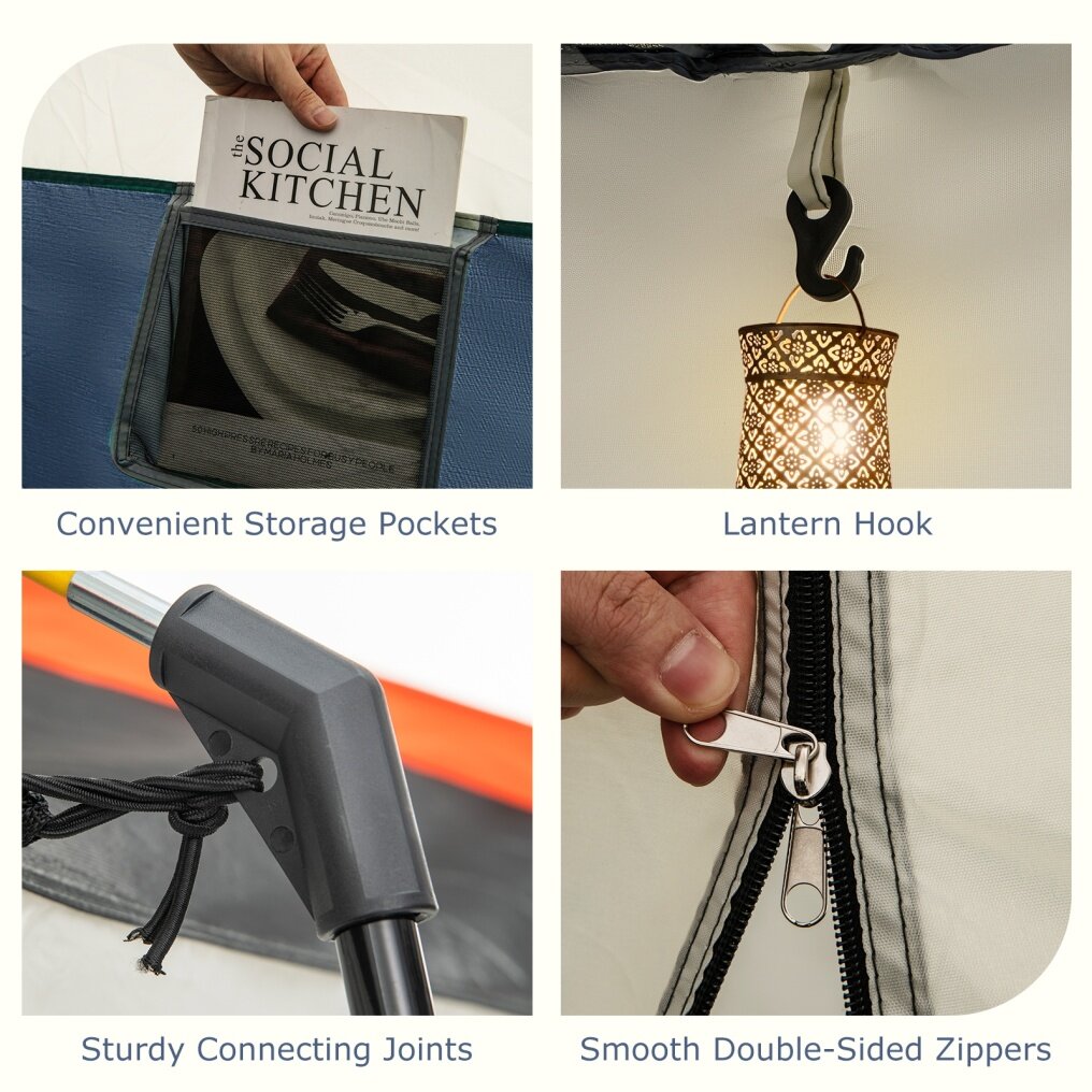● Sturdy and Stable Construction: Built to withstand outdoor elements, the camping tent adopts high-strength fiberglass poles that provide robust support. For added stability, it comes with 16 metal ground stakes and 8 wind ropes to secure each corner firmly.
