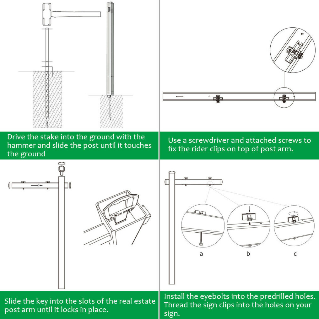 ● No-digging Installation: The real estate signpost is engineered to be installed in seconds with the steel power stake that requires absolutely no digging. Simply use a hammer to drive the stake into the ground and then the post slips over the top for securing fit.