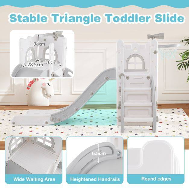 6 in 1 L-Shaped Toddle Slide: The Kids slide offers multifunctional fun with a telescope, climber, slide, basketball hoop, hiding spot and storage area. It’s a complete entertainment hub that keeps your child engaged and active.