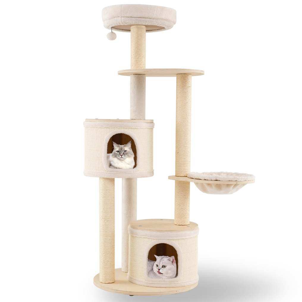 Stable and Reliable Construction: This 152cm tall wooden cat tree is constructed with a solid plywood frame, enhanced by a thickened and widened base, ensuring durability and stability. In addition, it features anti-slip foot pads for floor protection and round corners for enhanced safety.