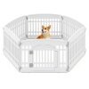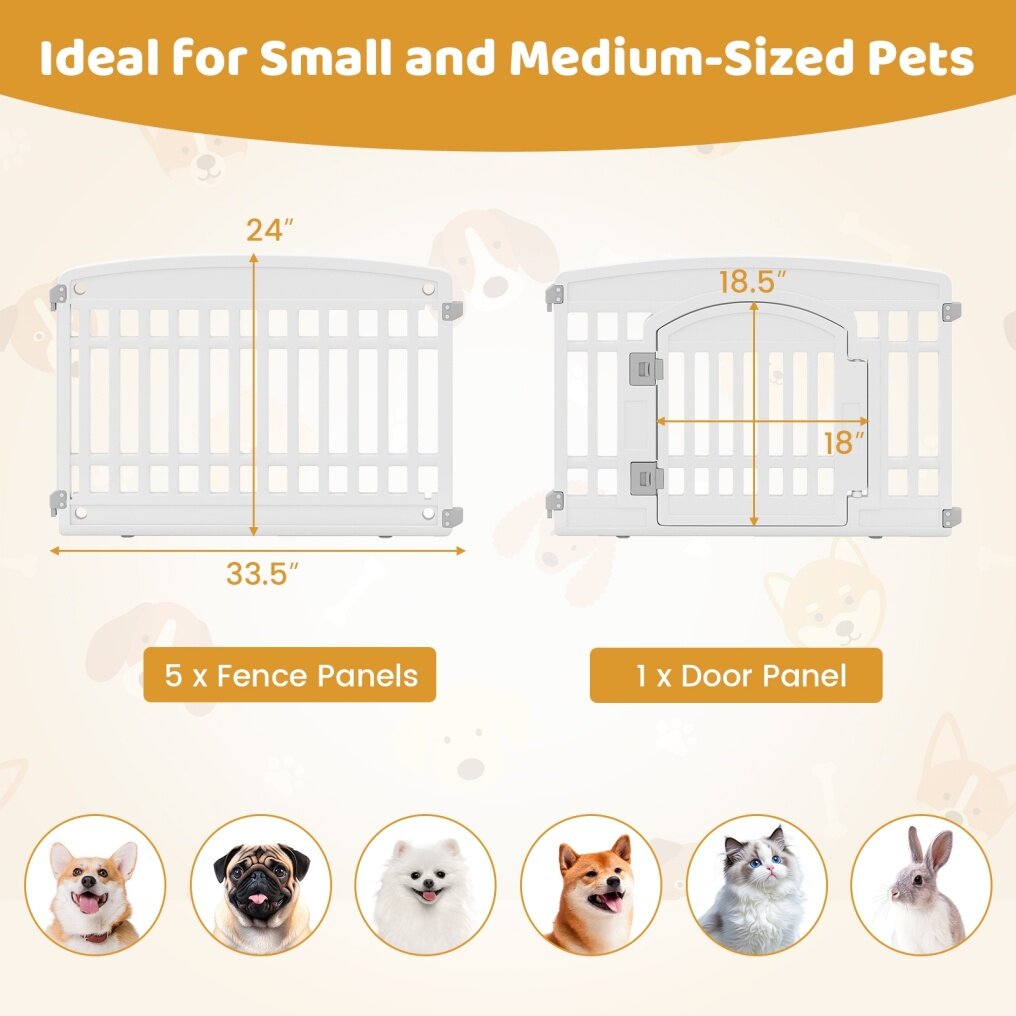 This plastic dog playpen includes 6 panels that can be arranged in various shapes like a hexagon, a house with a roof, or a rectangle, offering the freedom to customize the space as needed. Each panel measures 85 x 60 cm (L x H), ideal for small to medium-sized pets weighing up to 44 lbs. And there is a panel with a lockable door to ensure your pet’s safety while providing convenient access. Crafted from reliable HDPE material, this fence is built to withstand daily use, ensuring long-term performance, and waterproof and stain-resistant, making maintenance a breeze. Stability is key, whether set up inside with anti-slip suction cups that protect floors from scratches or outdoors with secure gripping stakes that hold firmly in the grass. Easy to assemble and disassemble, this folding pet playpen is a perfect companion for your home or on a trip!