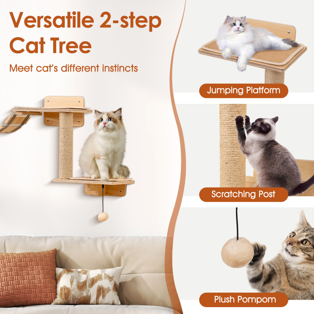 Appealing to a cat's diverse instincts: The wall-mounted cat shelves feature jute rope-wrapped posts, interactive toys, elevated perches, and a bridge that will capture your cats' attention and keep them entertained for hours. Additionally, the curved hammock provides a cozy place to relax.