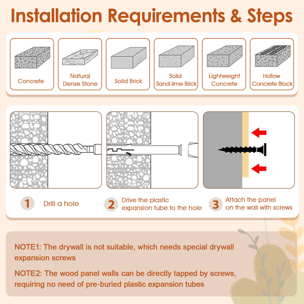 Installation Requirements & Steps: The cat climbing wall can be installed on most solid wall surfaces. All you need to do is drill a hole in the wall, then drive the plastic expansion tube into the hole, and finally, attach the panel to the wall with screws. Drywall is not suitable and requires special drywall expansion screws.