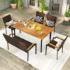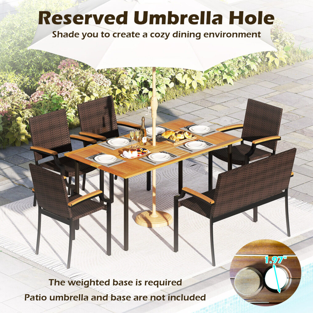 ● Acacia Wood Tabletop: The dining table features an acacia wood tabletop to offer natural elegance and long-lasting outdoor use. With 1.97” reserved umbrella hole, the tabletop can be inserted your patio umbrella (not included)to shade you to create a cozy dining environment. The weighted base is required, not included.