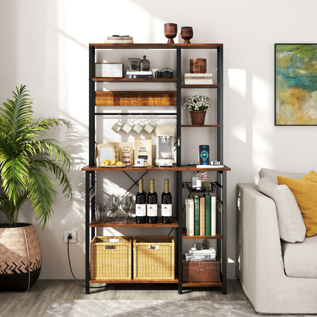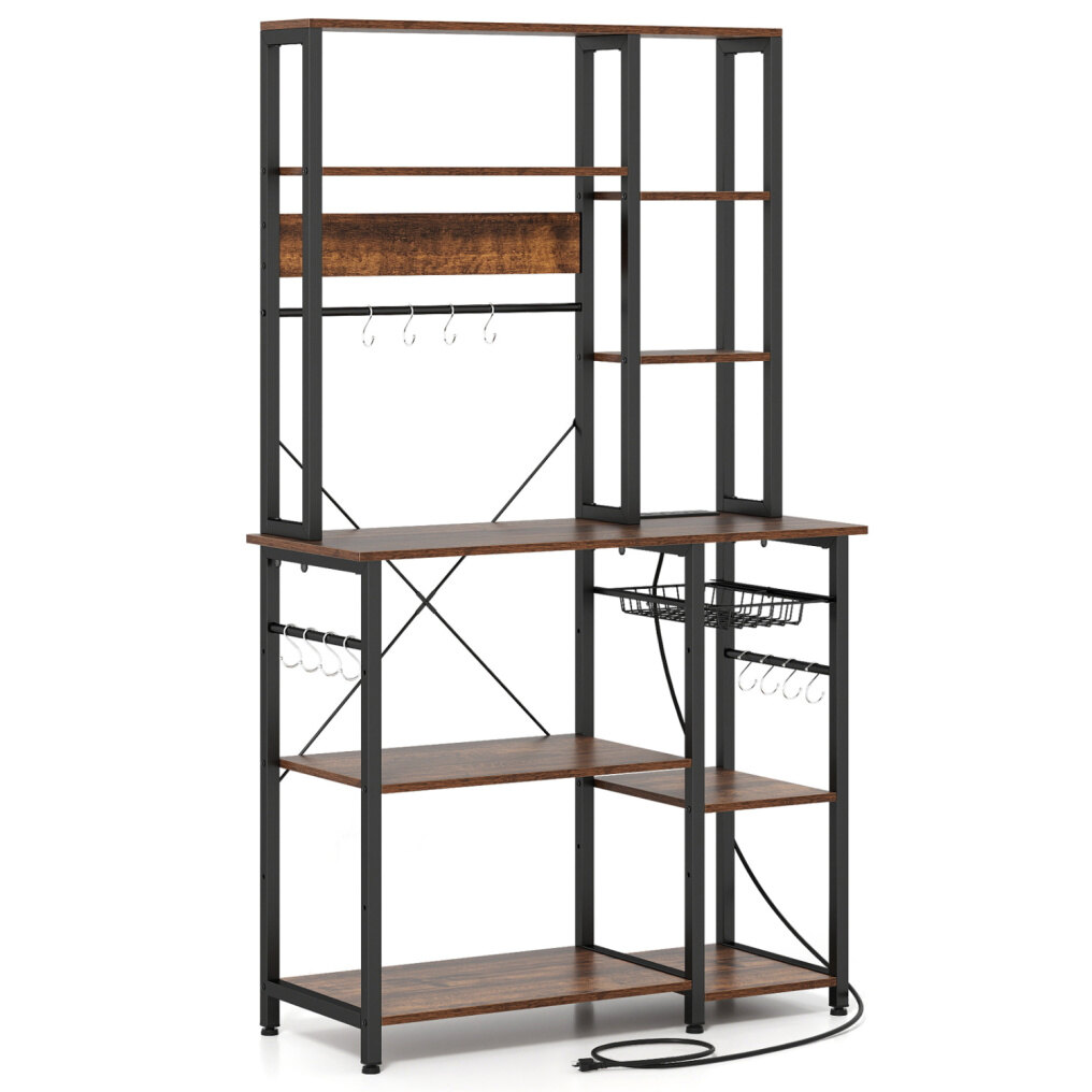 ● Vintage Charm for Wide Use: Featuring rustic wood grains, this baker's rack with power outlet brings both aesthetic appeal and practicality to various settings. It fits beautifully in kitchens, dining areas, or as a cozy addition to a home bar or coffee nook.
