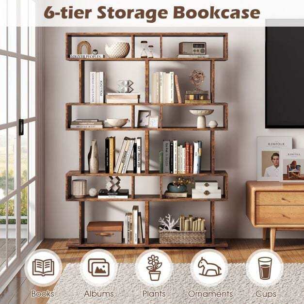 6-Tier Bookshelf with 2 Anti-Tipping Kits for Home Office-Rustic Brown