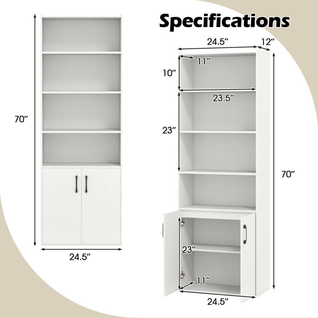 With a thoughtfully designed 4-tier open shelf and a spacious 2-door storage cabinet, this bookcase offers abundant storage space for all your essentials. Adjustable shelves with multiple positions allow you to customize the storage space to accommodate items of various sizes. The bookcase is equipped with 2 anti-toppling devices and a stable base for unmatched stability and safety. Its elegant design seamlessly blends into any room decor, making it a versatile addition to your kitchen, living room, or study. The user-friendly details of the bookshelf such as convenient handles, metal hinges, and non-slip foot pads enhance the functionality and ease of use. Additionally, the easy-to-clean surface ensures hassle-free maintenance, keeping your space looking pristine at all times. Transform your space with this stylish and functional bookcase that combines practicality with aesthetic appeal.