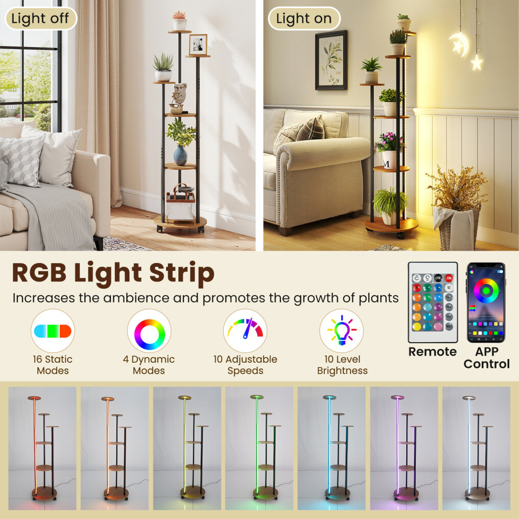 ● Adjustable RGB Light Strip: The plant stand comes with an RGB light strip, enhancing both atmosphere and plant growth. Plus, you can choose from 16 static modes, 4 dynamic modes(Flash/Strobe/Fade/Smooth), 10 speed options, and 10 brightness levels to perfectly complement any mood or interior design.