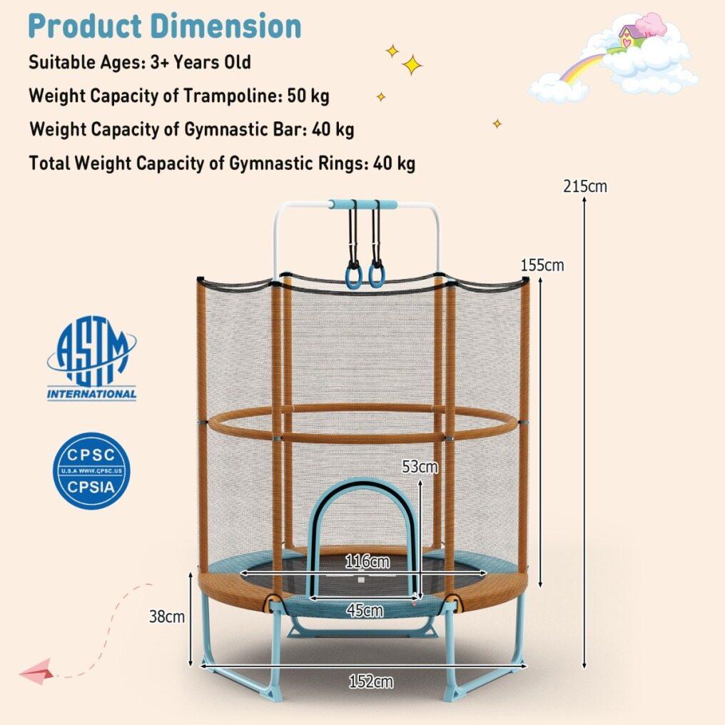 ● More Options, Various Fun: In addition to jumping, kids are able to enjoy different fun with the gymnastic bar and rings. Besides, the gymnastic bar and rings can be detached if not required. And the gymnastic rings are designed with length adjustable straps to adapt to children of various heights.