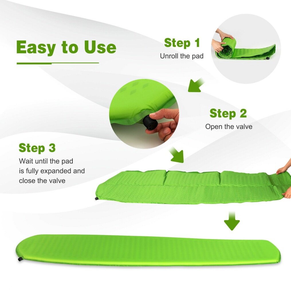 ● Effortless Inflation and Deflation: Instead of using a foot, mouth, or air pump, which wastes your breath and effort, this advanced self-inflating camping mattress can be inflated in 1-2 hours and deflated in seconds, bringing you great convenience. Unroll the pad, open the valve, and then wait until it is fully expanded.
