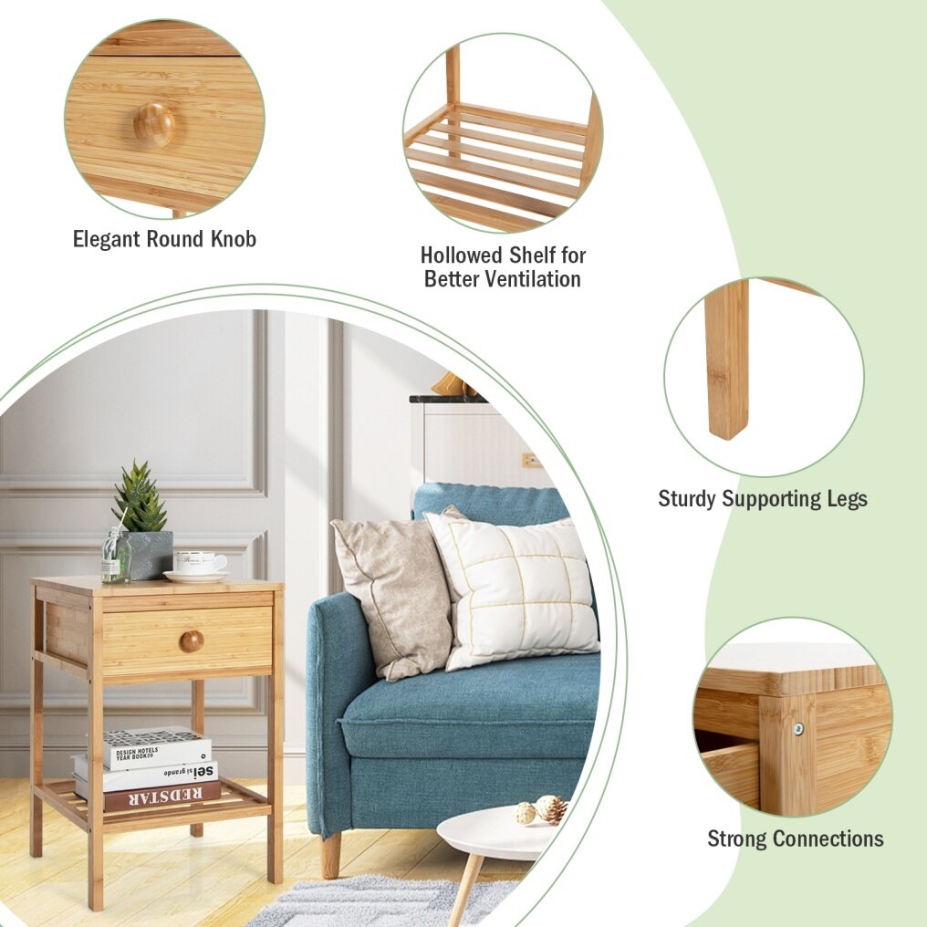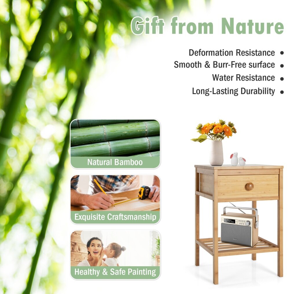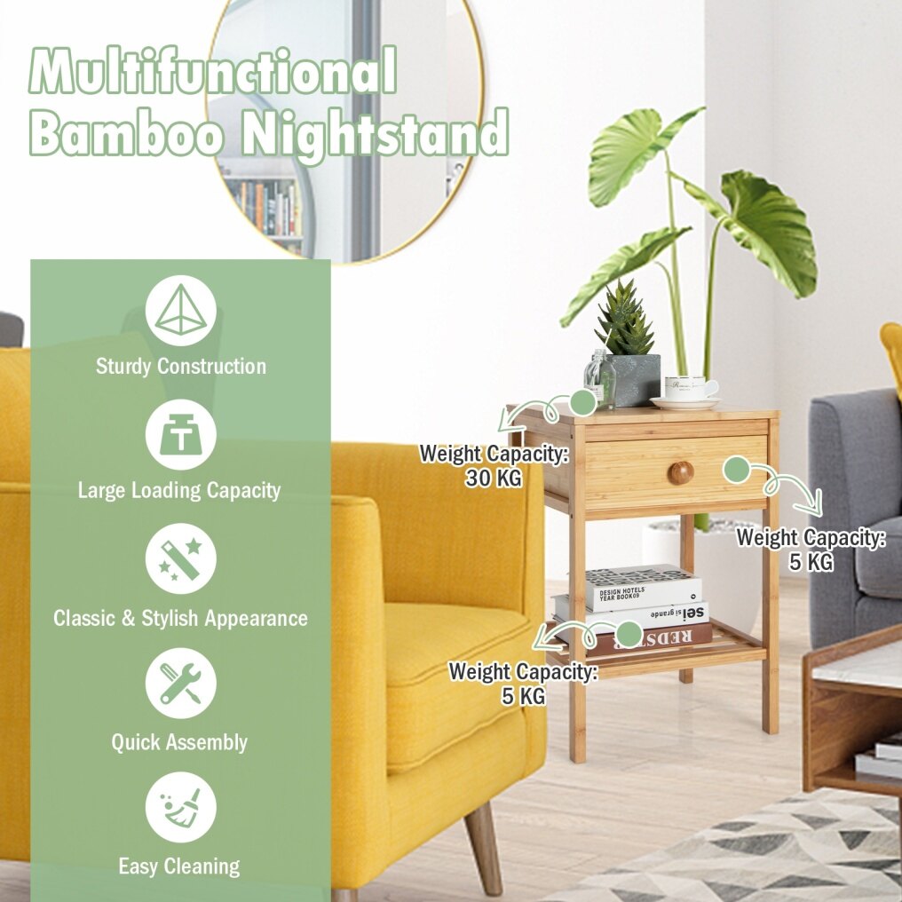 Natural Material & Sturdy Frame: The nightstand is made of high-quality MDF and natural bamboo with a durable solid wood construction. The 4 thick wooden legs ensure higher stability, with the tabletop holding up to 30kg and the drawer and open shelf up to 5kg respectively.