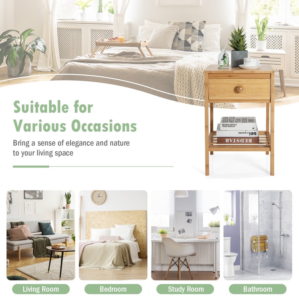 Our bamboo nightstand has a drawer and an open storage shelf, providing a variety of storage space for your bedroom essentials, you can store books, glasses, lamps, ornaments and more items. The compact design of the cabinet is suitable for small spaces and can be used as a sofa side table, or storage cabinet in the living room or entrance. And the cabinet is made of solid bamboo, which is durable and stable with large load-bearing. In addition, natural colours with smooth lines make it look great with the rest of your furniture.