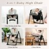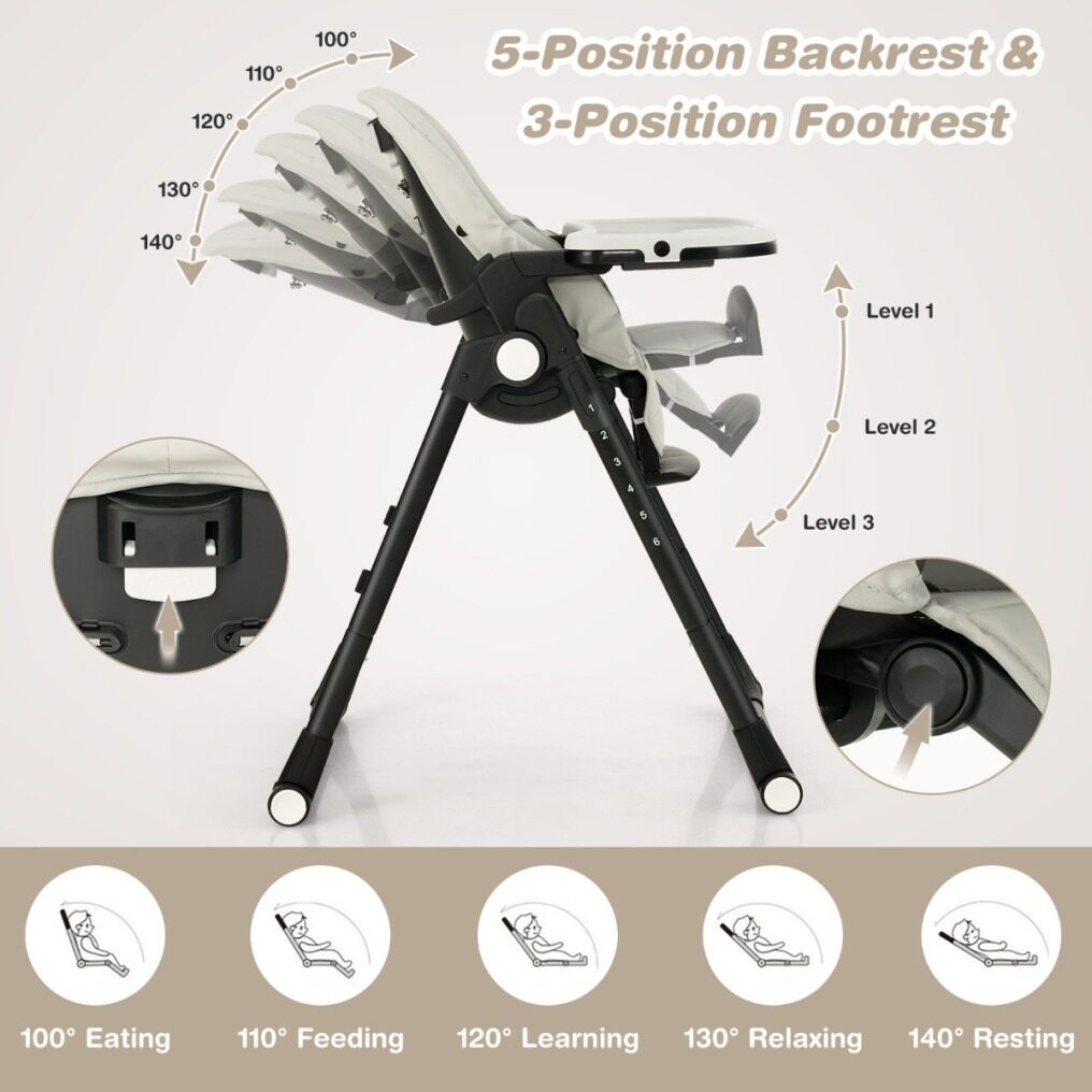 Multi-adjustable Baby High Chair: Our baby high chair features 6 adjustable heights, 3 footrest lengths and positions, 5-position backrest, and 2-position double trays, meeting your different needs and accompany the growth of your kid. With 4-in-1 design, this baby high chair can be used for your baby to rest, play, eat and more.
