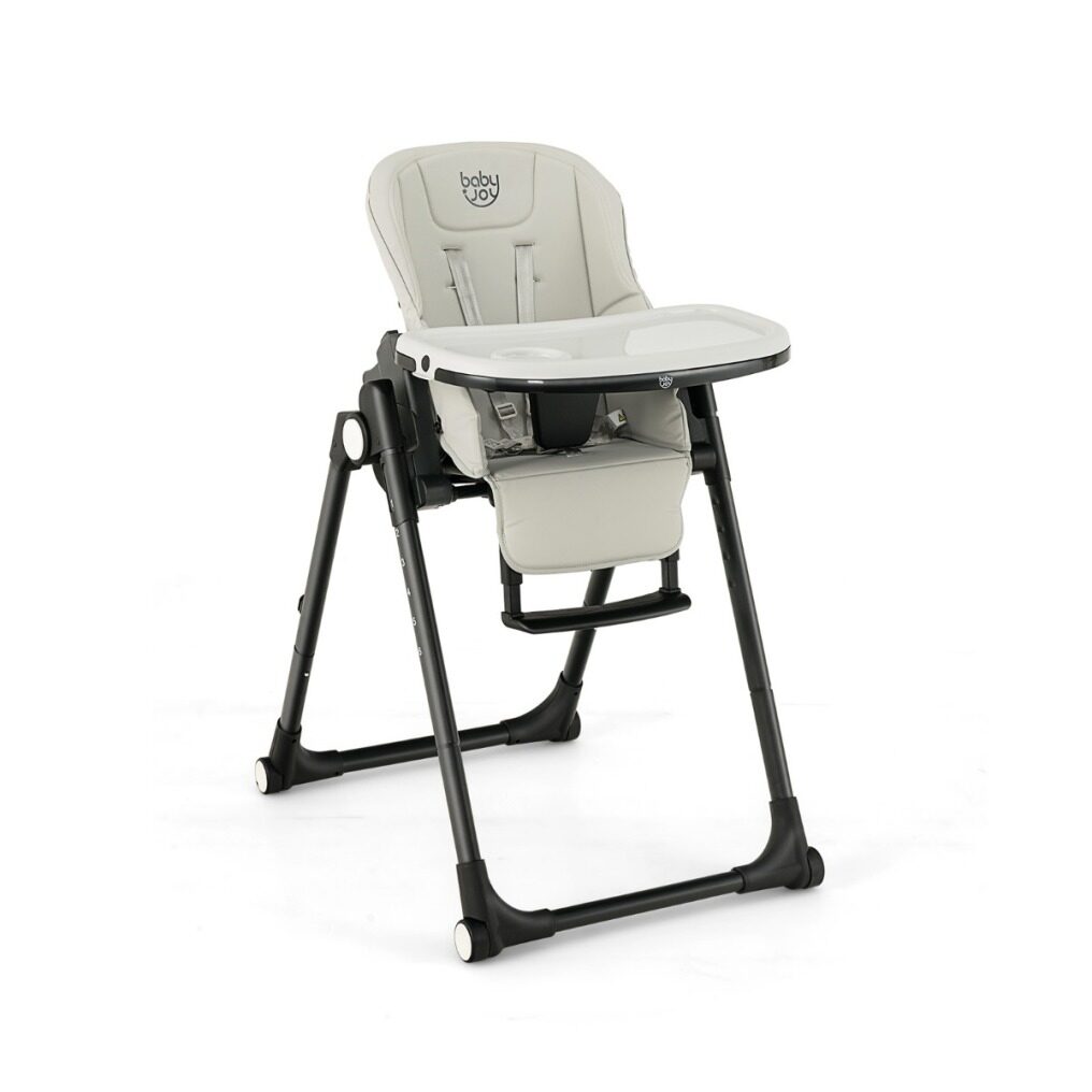 This baby high chair will be a great companion during the growth of your baby. With adjustable seat height, backrest and footrest, this high chair provides comfortable sitting experience according to different situations, suitable for baby to eat, rest, play and more. The double trays feature adjustable positions and can be removed when not in use. Also, the trays are dishwasher safe. Equipped with rolling wheels, this baby high chair is effortless to move around. Constructed with high quality aluminum alloy frame and PP material, this toddler high chair is harmless to the health of your baby and capable of long timer service. The seat cushion is detachable and washable which largely simplifies cleaning steps.