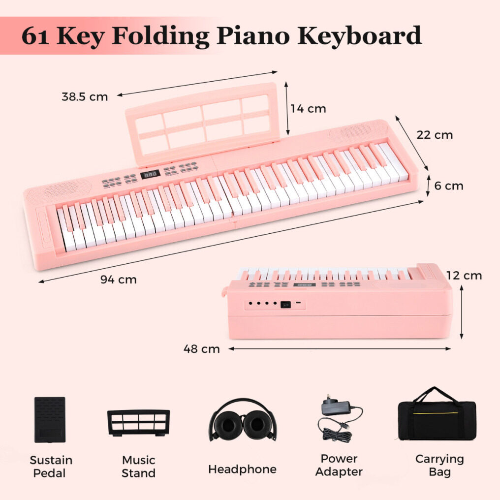 Folding and Portable Design: The portable piano can be easily folded down into a compact size of 48 x 22 x 12 cm(L x W x H). Additionally, it weighs only 3.1kg allowing for convenient carrying. The kids piano keyboard features dual power supply ways: 4 x AA batteries (not included) and power adapter.