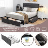 The drawers are wrapped in wear resistant polyester faux linen and filled with new cotton for a soft and comfortable texture. All the drawers are equipped with castors for noiseless movement. The bed frame is supported by a sturdy metal structure and 10 wooden slats, enough to withstand a weight of 330 lbs. And the central bed rib comes with silent foam to reduce noise. Non-slip pads is fitted at the base to avoiding scratching the floor. In addition, the metal legs at the head of the bed have 7" of pre-drilled holes for you to easily match the different sizes of headboards. In addition, raised slots on both sides of the bed are designed to facilitate the fixing of your mattress, thus eliminating the need for you to purchase a spring box for this bed frame.