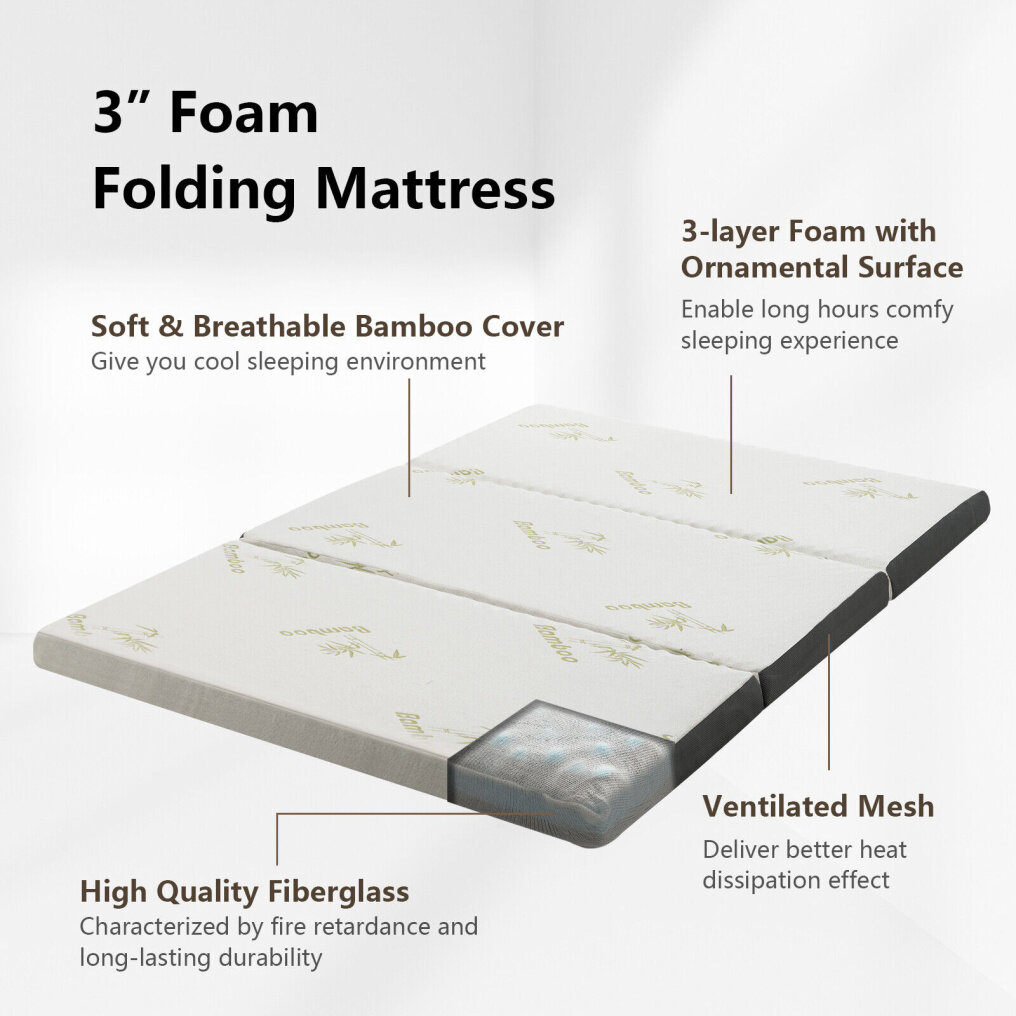 ● Upgraded 3-layer Memory Foam: This 3-inch folding mattress is designed with 3-layer structure that includes soft and breathable bamboo cover, high-quality fiberglass, memory foam with ornamental-patterned surface. Meanwhile, 3-layer of soft memory foam supports your joints at correct positions to minimize pressure points, providing cloud-like feel for your sleep.