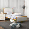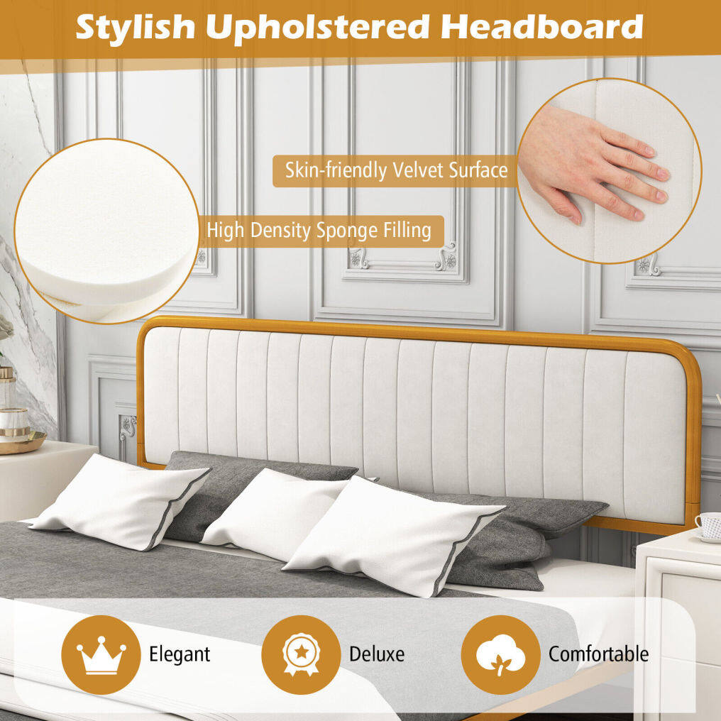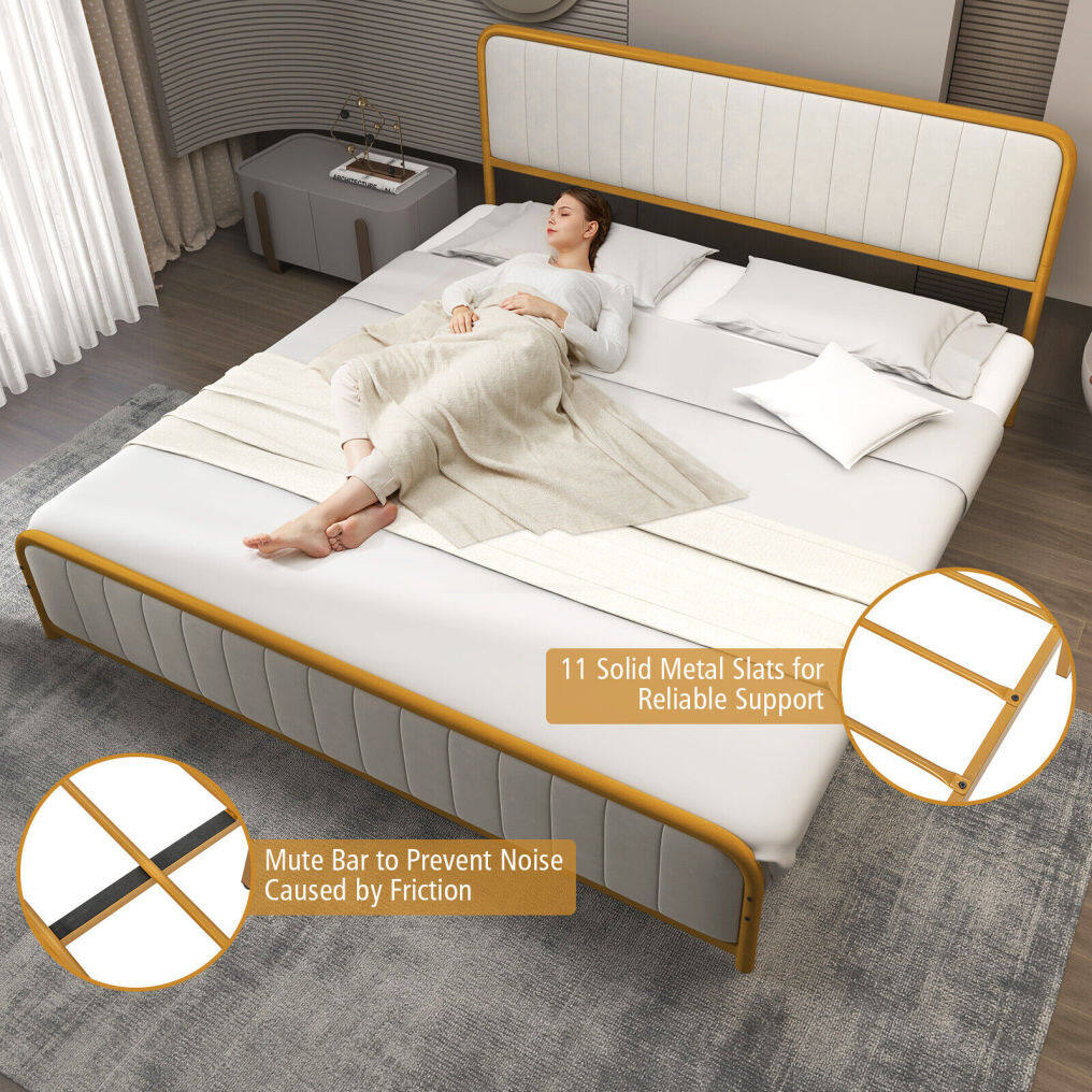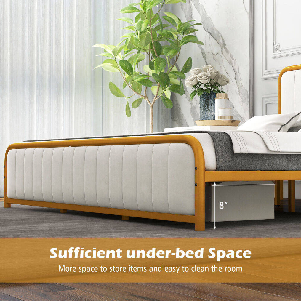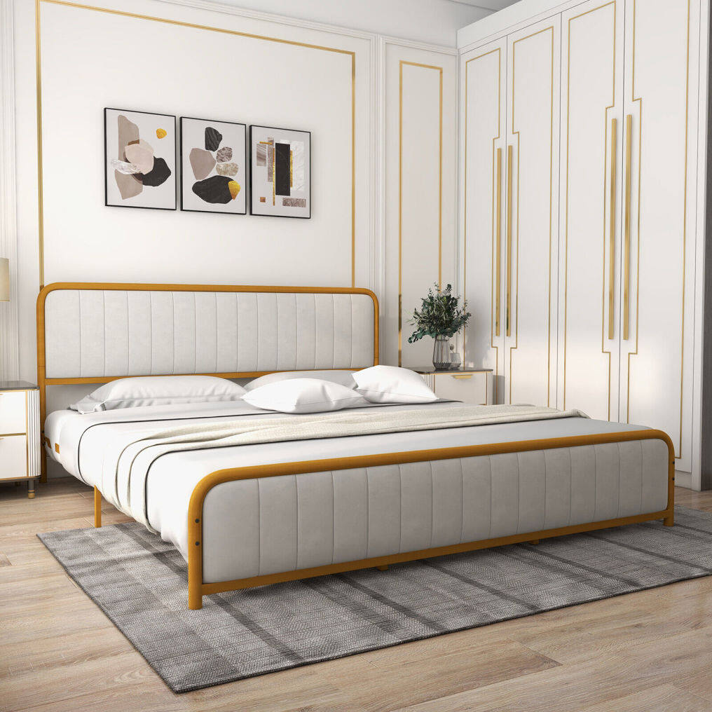● Luxury and Elegant Appearance: The bed frame stands out its combination of golden lacquered metal frame and off white velvet headboard, making it an aesthetically-pleasing piece for any decoration from vintage to modern. This contemporary gold bed frame delivers perfect visual effect and looks classic in any bedroom.