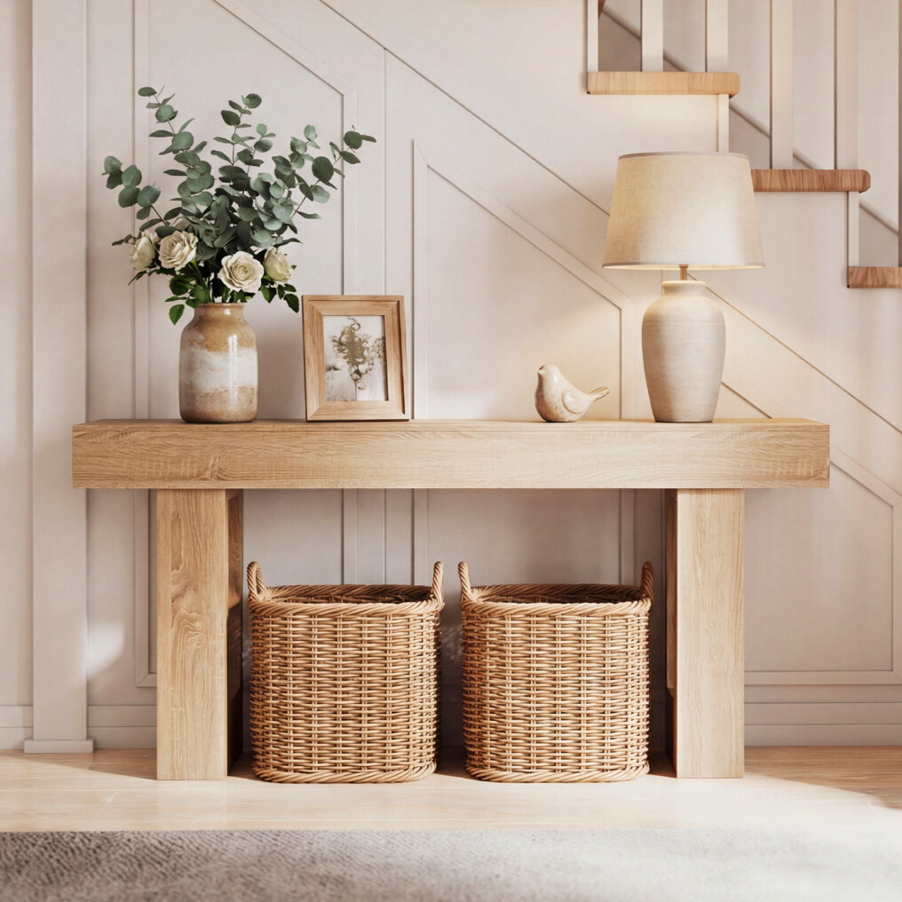 ● Farmhouse Elegance: Blending natural wood grain finish with clean lines, this hallway table adds cozy warmth and classic rustic appeal to any space. Its versatile design blends seamlessly with both traditional and contemporary styles.