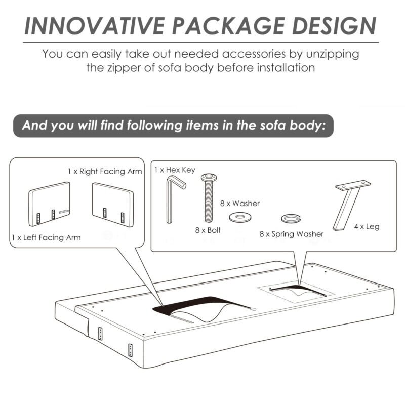 ● Simple Assembly: When you get the package, you can find all parts of the sofa in the sofa body, like armrests, sofa legs and screw kit. The assembly processes are quite easy for everyone to understand and complete in short time. It's an ideal cozy sofa for small living rooms or dormitories.