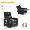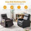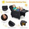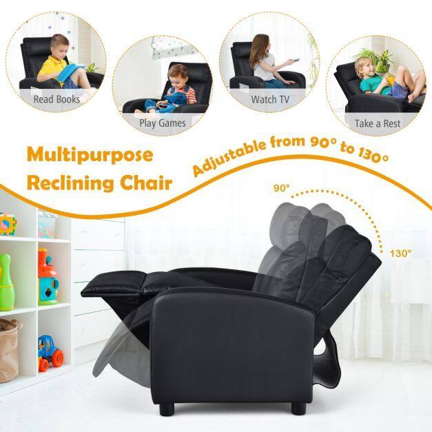Featuring an adjustable design from 90° to 130°, this multipurpose recliner offers a cozy place for kids to read books, watch TV, play games, take a nap, etc. The high-density sponge padding and soft PU leather surface provide optimal comfort. Besides, the PU leather surface is also waterproof, wear-resistant and easy to wipe clean. The sturdy wooden frame and anti-slip feet not only ensure great stability, but also make it safer for children to climb up and down on the chair. In addition, there is a side pocket to keep your kids’ favorite books, small toys or snacks with reach. With the simple and stylish design, this kids recliner will be a perfect addition to the child's bedroom, playroom, living room, home theatre, daycare, etc.