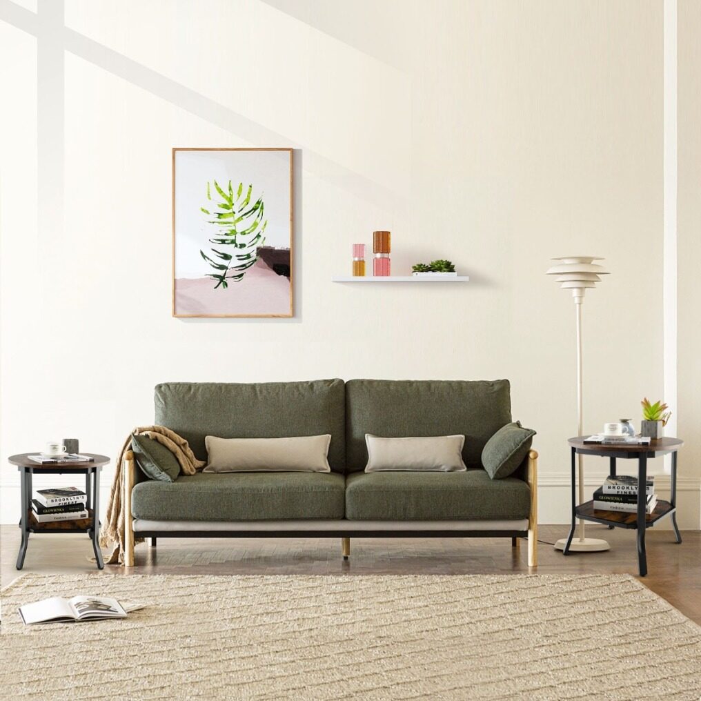 It is great for placing lamp, books, magazines, bins and other household items, save space and makes items within reach. Powder coated metal frame is stable and rustproof for long term use. The smooth surface with natural wood grain is waterproof and wear-resistant for practical daily use. What's more, round shape will protect you from bruises caused by sharp corners, creating a safer environment for children to a certain extent. When you sit on the sofa and enjoy a relaxing afternoon with family, this sofa side table is the perfect companion for snacks and drinks, come and buy it!