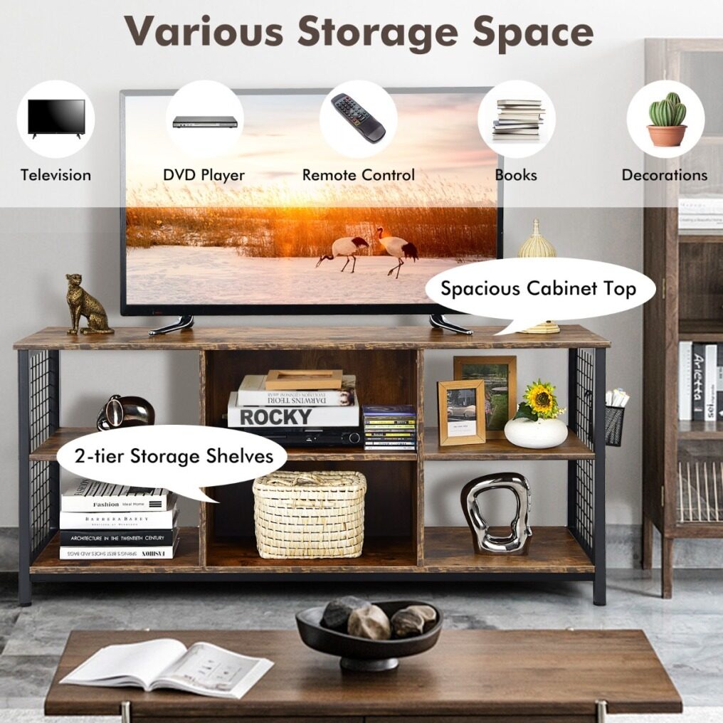 Have you found a favored TV stand? Our TV cabinet would be one of the appropriate choice for you. Spacious desktop is compatible with most flat screen TVs up to 65”. Moreover, the 3-tier open shelf and additional storage basket provide you with ideal storage space to hold plenty of items in a neat and orderly way. In addition, thanks to the 2 cable management holes, all the messy wires can be hidden. The industrial TV stand is harmoniously combined with any interior decoration, which makes it ideal for living room, bedroom, reception room, etc.