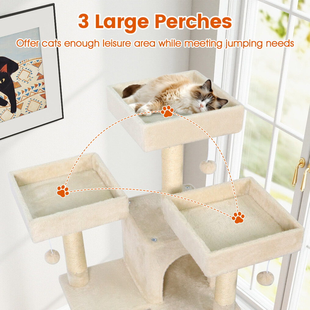 ● Comfy Living Areas: The multi-level cat tree comes with 2 large cat condos, which offer a comfy spot for your cats to lounge and sleep. Plus, the wide jumping platforms and a cozy cat bowl add more comfort to your cats, while the 3 hanging balls provide entertainment and exercise for cats.