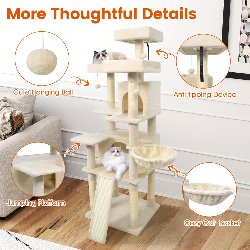 ● Satisfy Cat's Scratching Instinct: The tall cat tree features wear-resistant scratching posts, perfect for releasing your cat's natural scratching instincts. Plus, the ladder with a scratching board provides more space for cats to grind their claws.